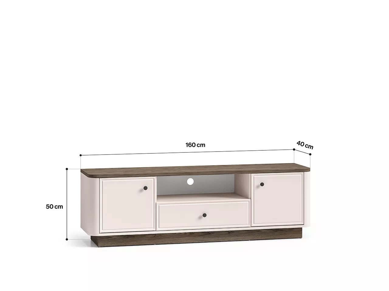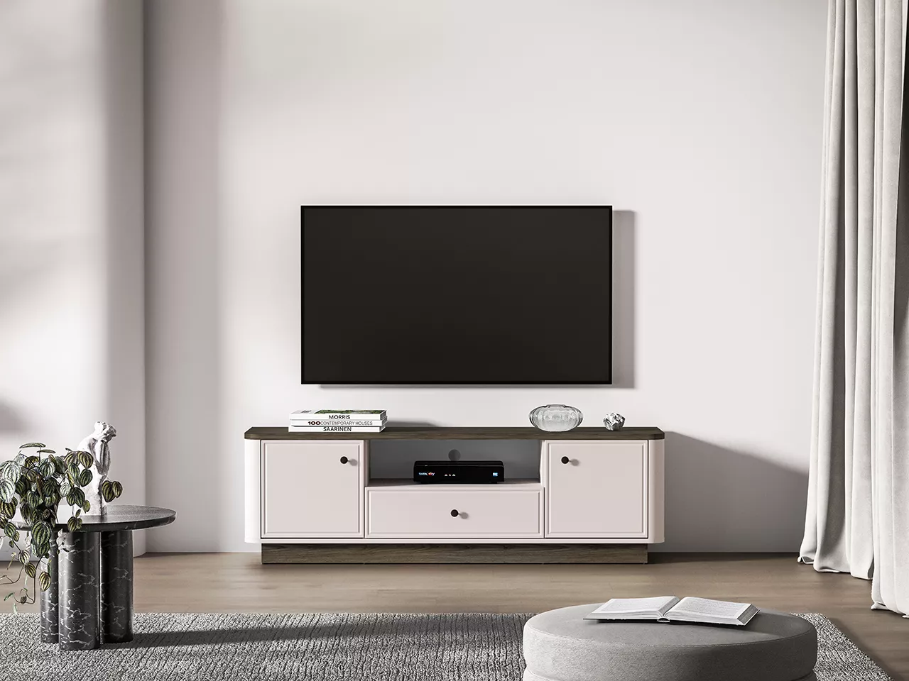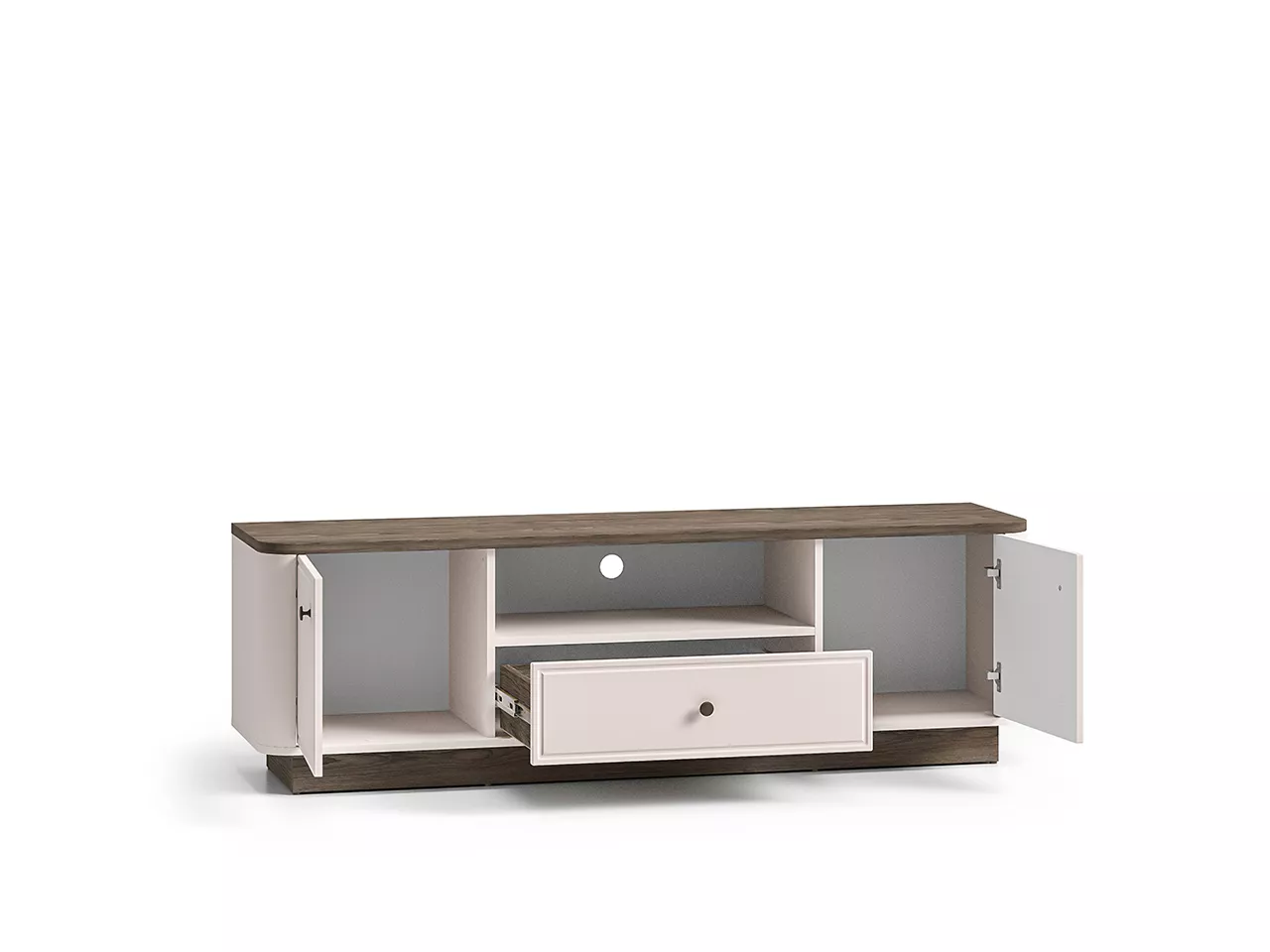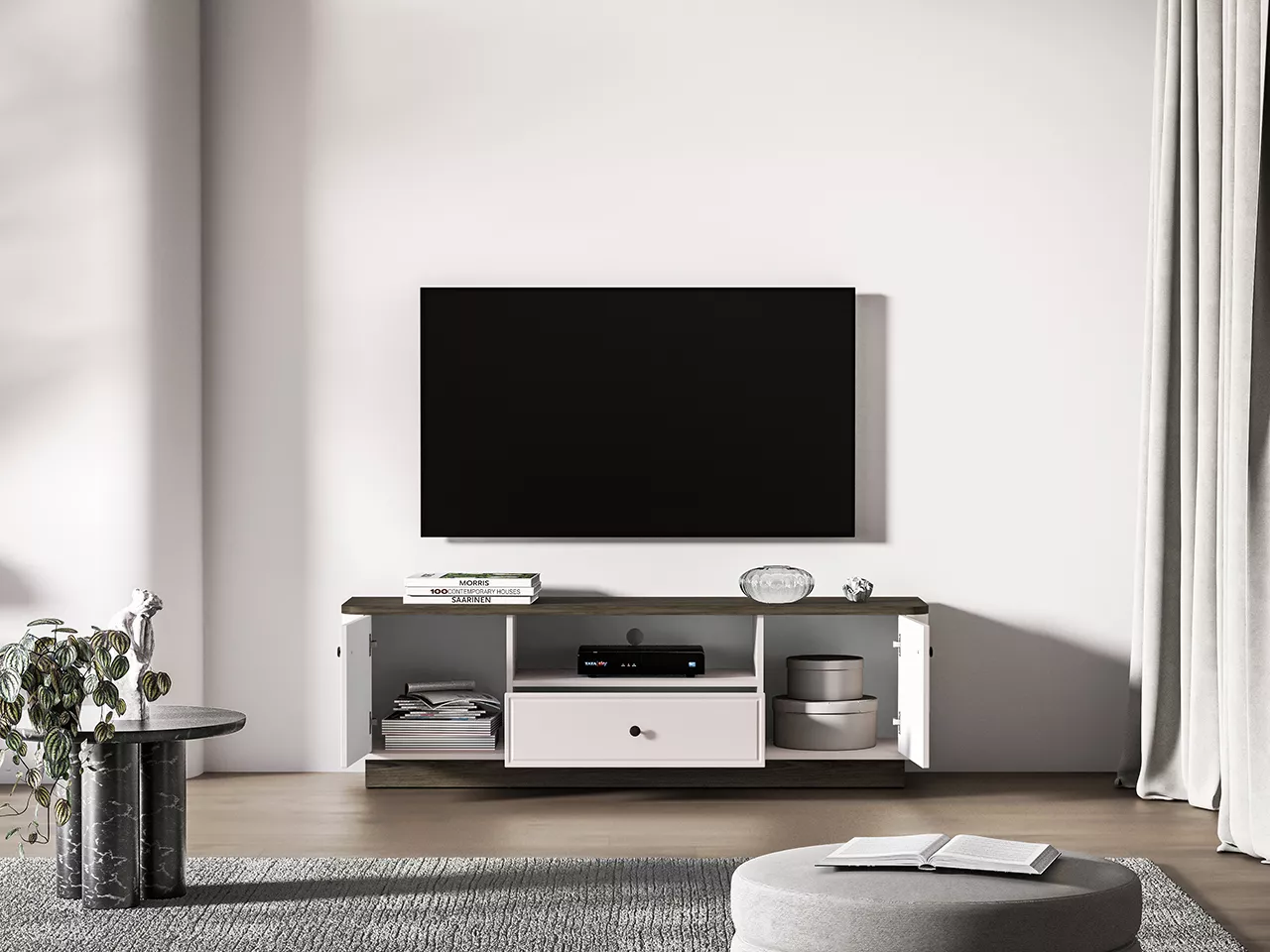 Televizní stolek ARLENA nabízí 2 uzavřené skříňky, 1 prostorný šuplík a otevřenou polici pro dekorace či elektroniku.