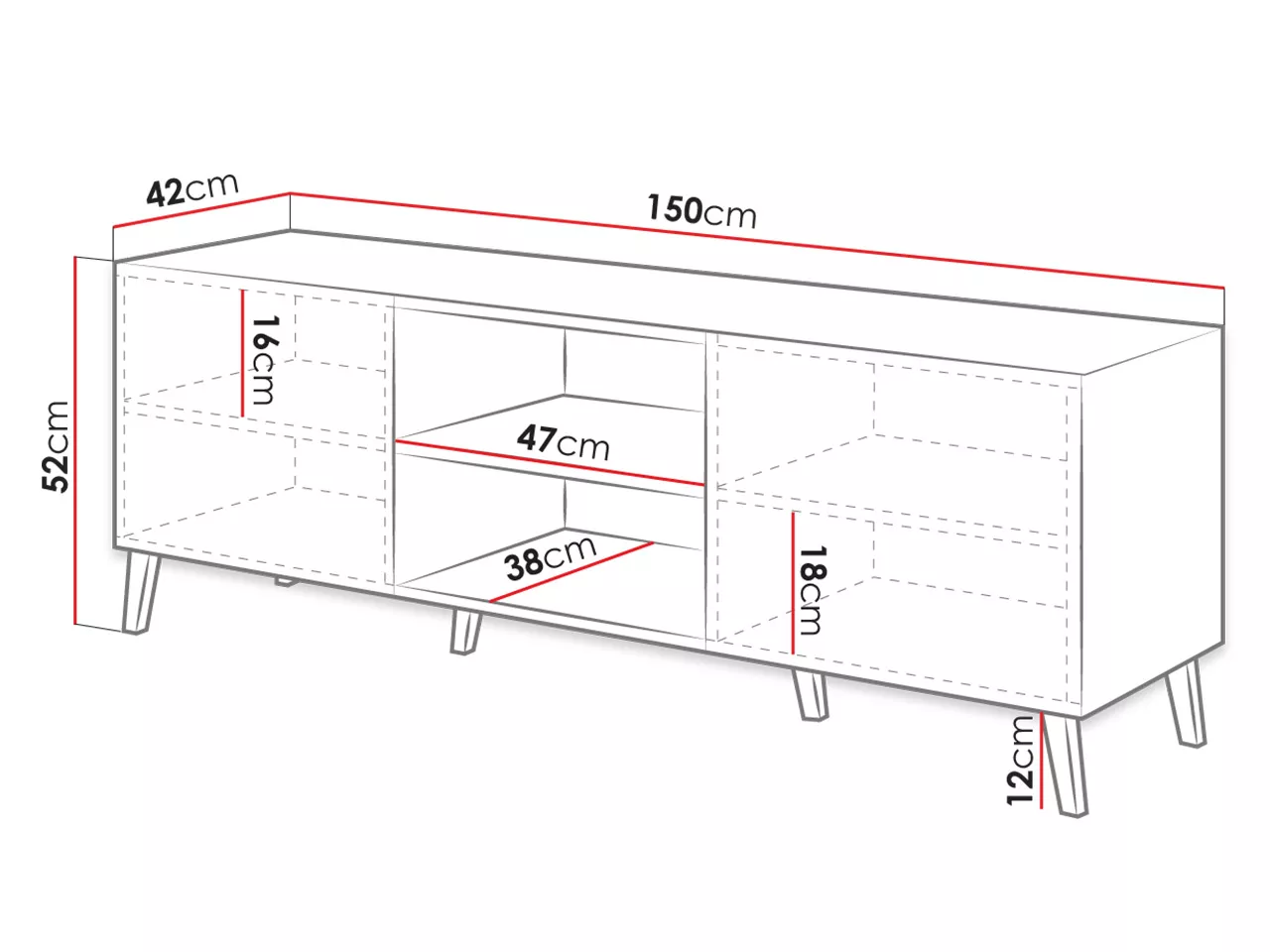 Prostor uvnitř stolku je rozdělen do několika zón. Díly s plnou přední částí poskytují možnost diskrétně skrýt uložené hry, filmy a elektroniku. Na druhé straně jsou otevřené police skvělým místem pro TV příslušenství.