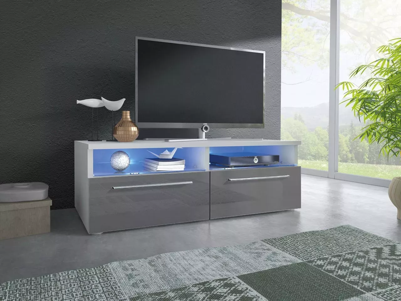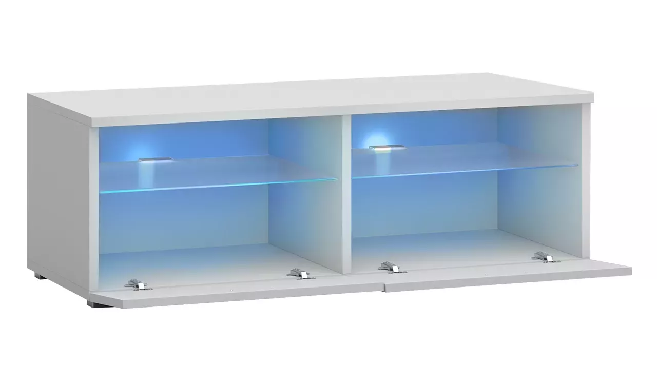 TV stolek je vybaven LED osvětlením v modré barvě, které dodá interiéru moderní charakter.