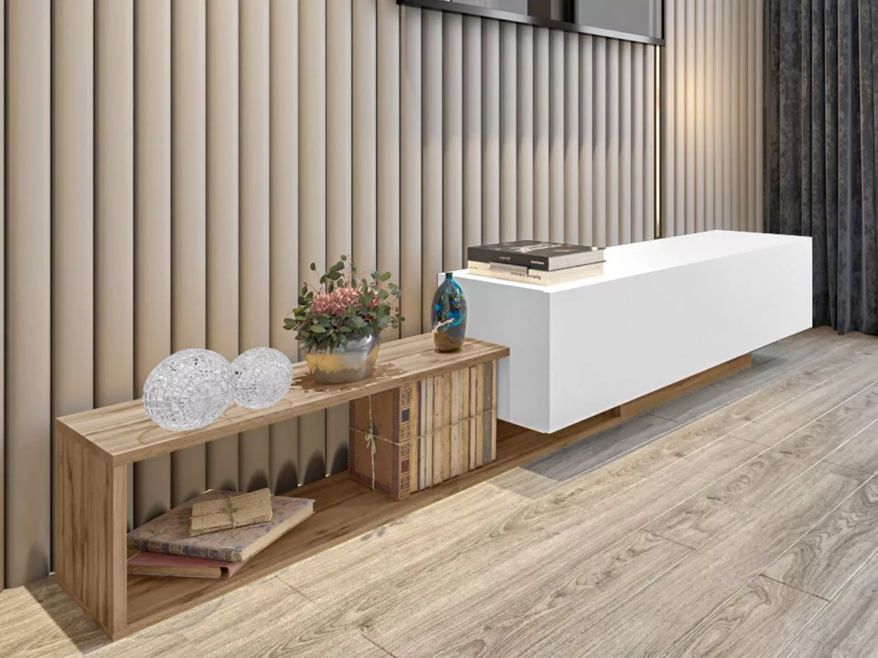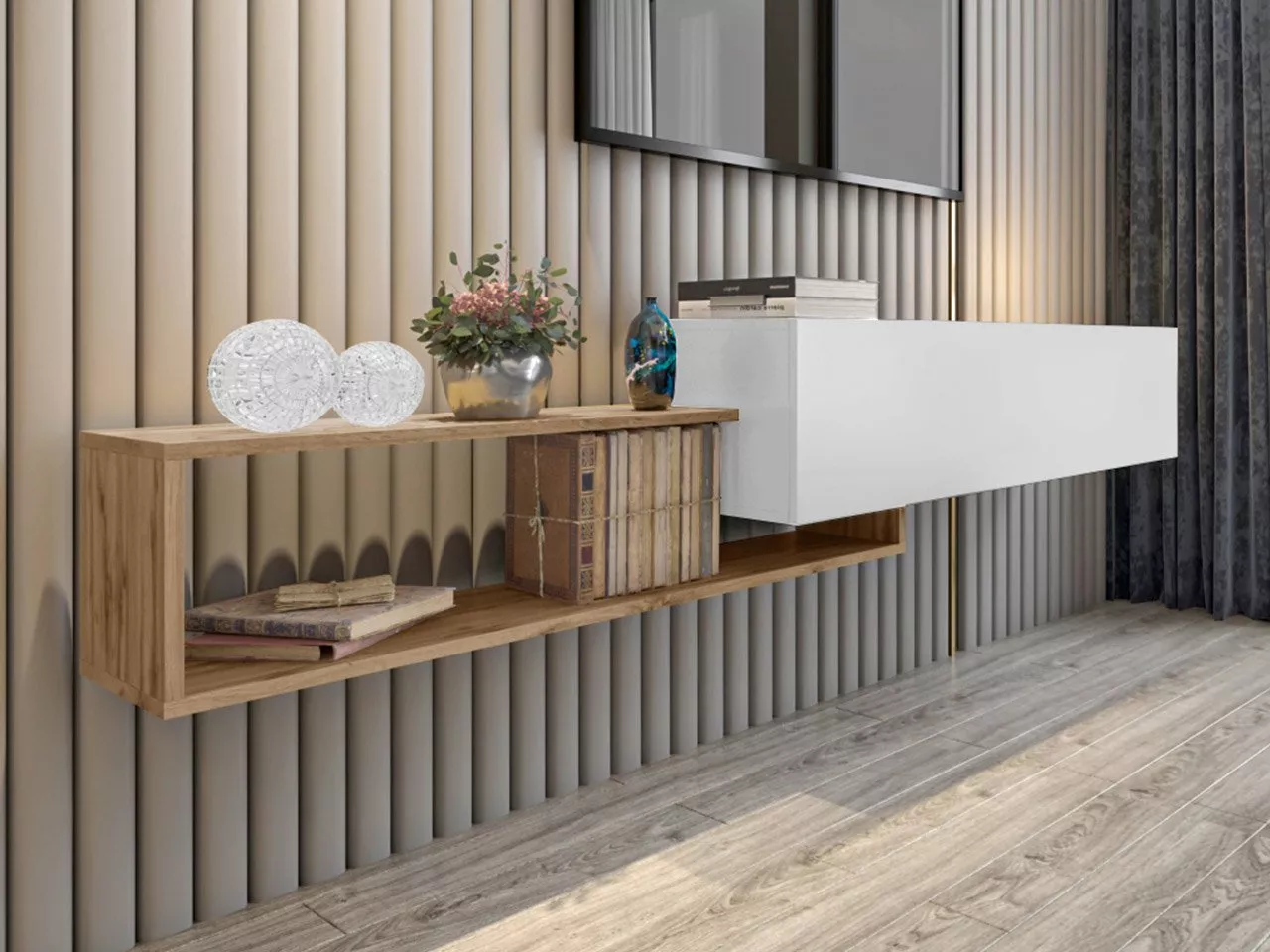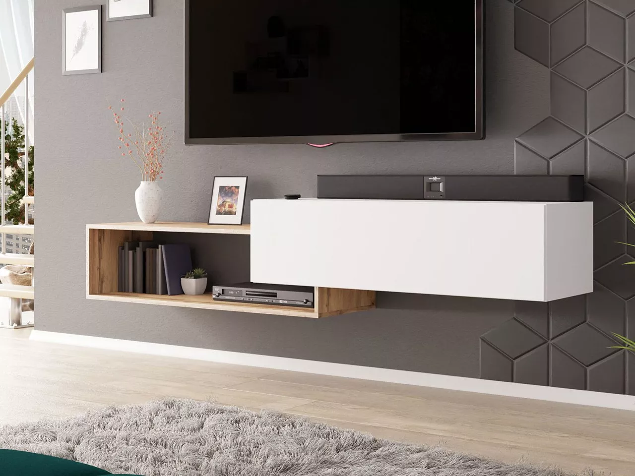Závěsný TV stolek TRELLA - dub wotan / bílý