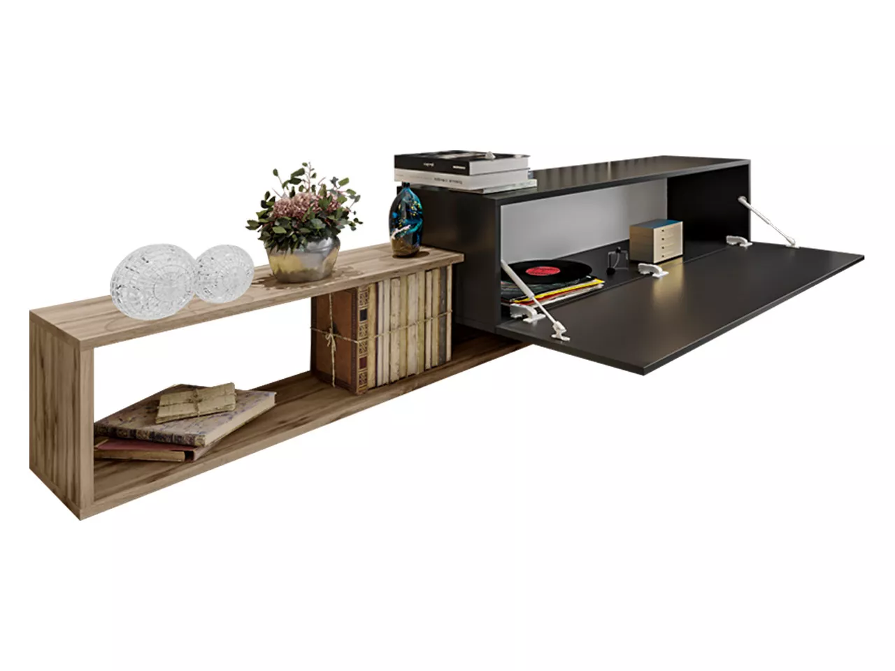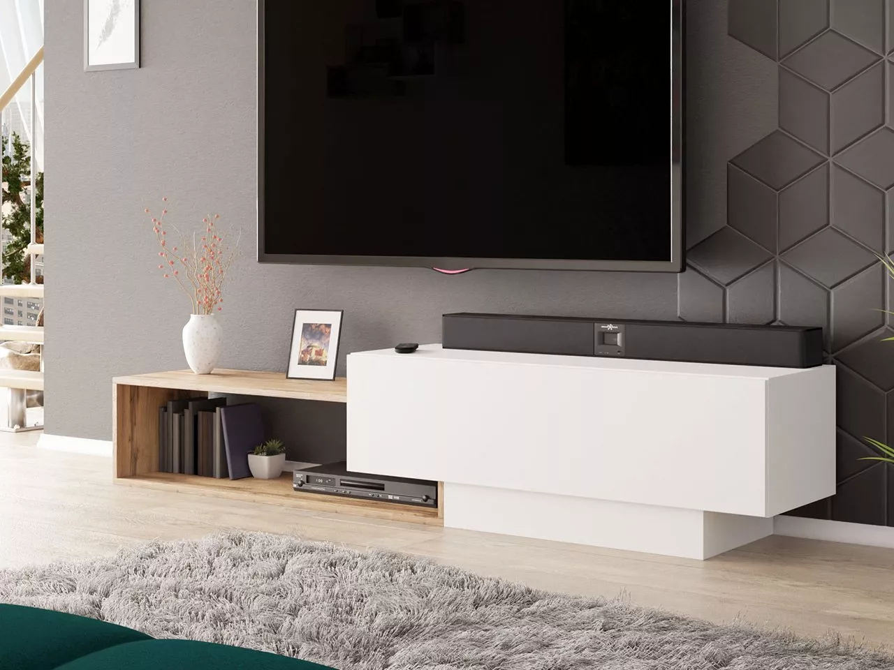 TV stolek TRELLA nabízí širokou škálu možností montáží. Vybrat si můžete, zda zvolíte montáž stojící či závěsnou i zda vám bude víc vyhovovat umístění polic na pravou nebo levou stranu. Za zmínku také stojí pohodlný systém otevírání PUSH TO OPEN, který vám usnadní každodenní používání.