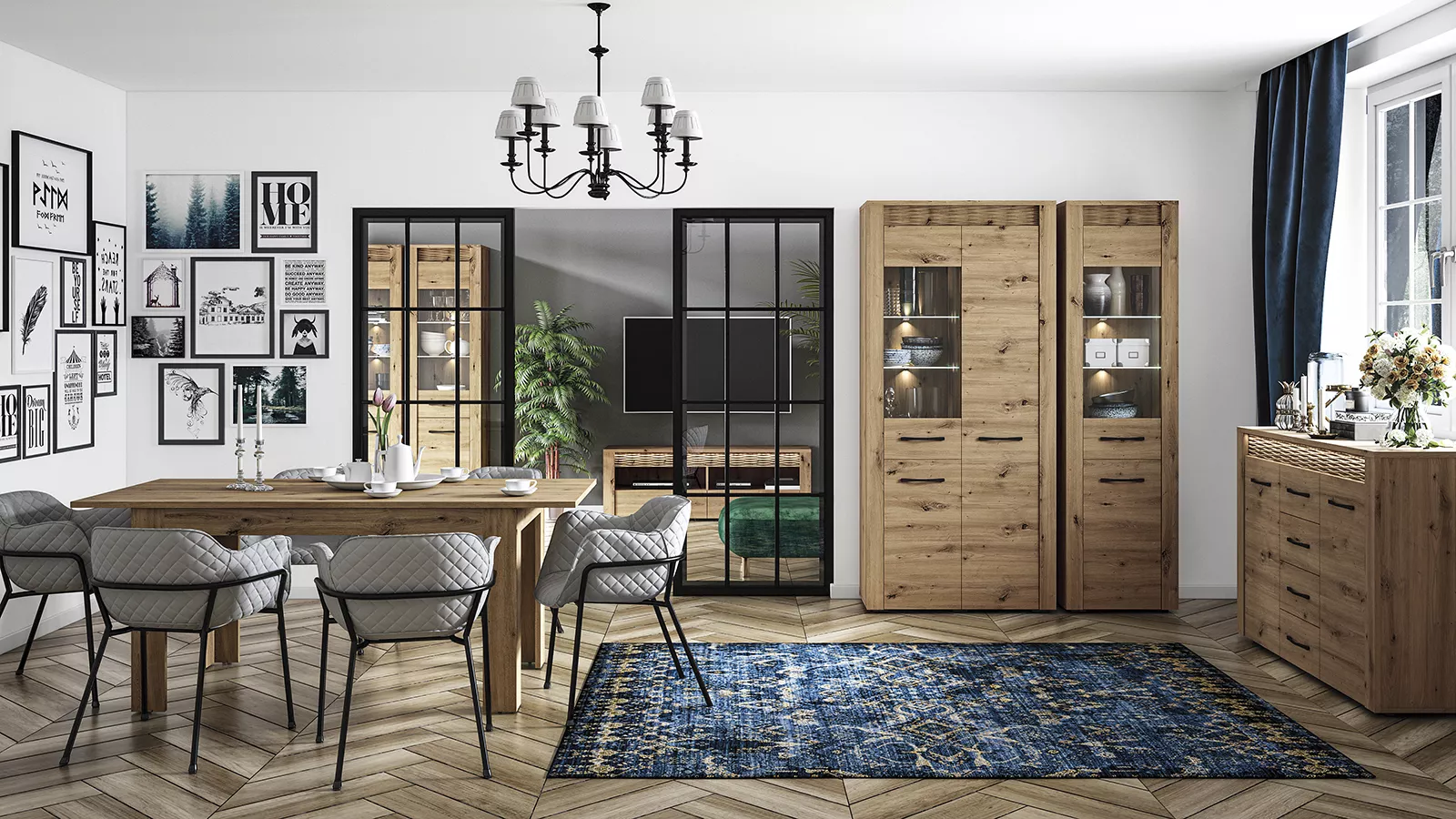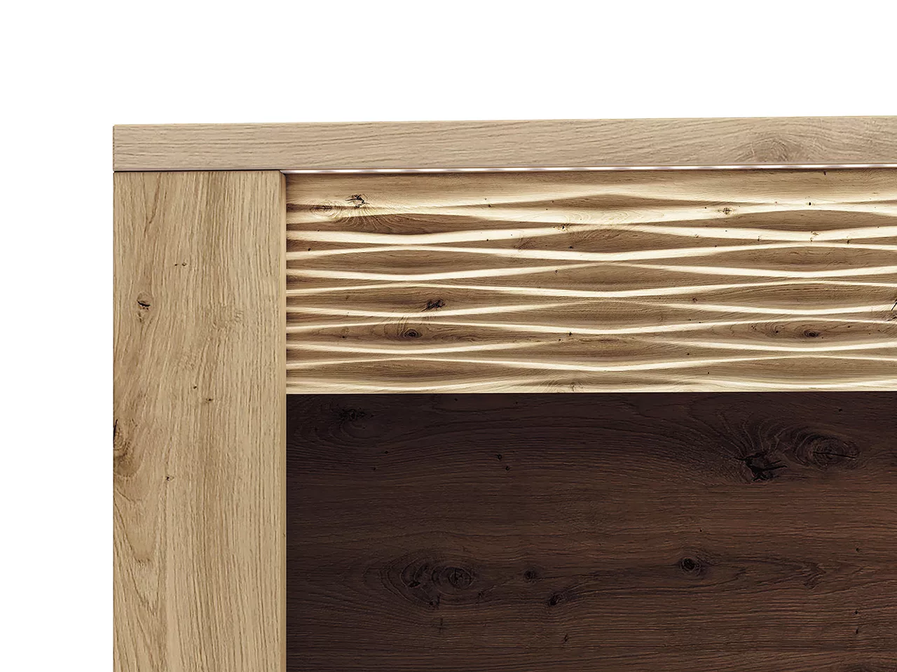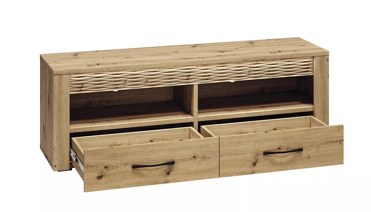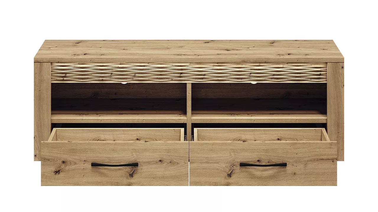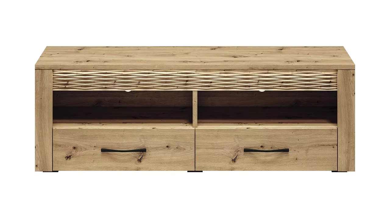 TV stolek DIANDRA se hodí do všech moderních obývacích pokojů. Disponuje osvětlením v horní zvlněné části, 2 přihrádkami, 2 plně výsuvné šuplíky se zpevněným dnem a 2 otvory pro vývod kabelů.