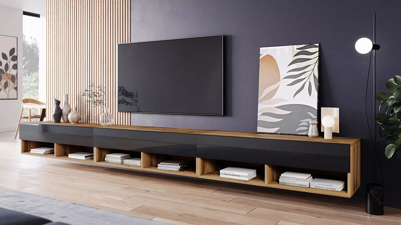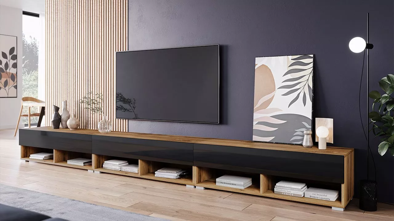Televizní stolek 300 cm WILLA A - dub wotan / lesklý černý