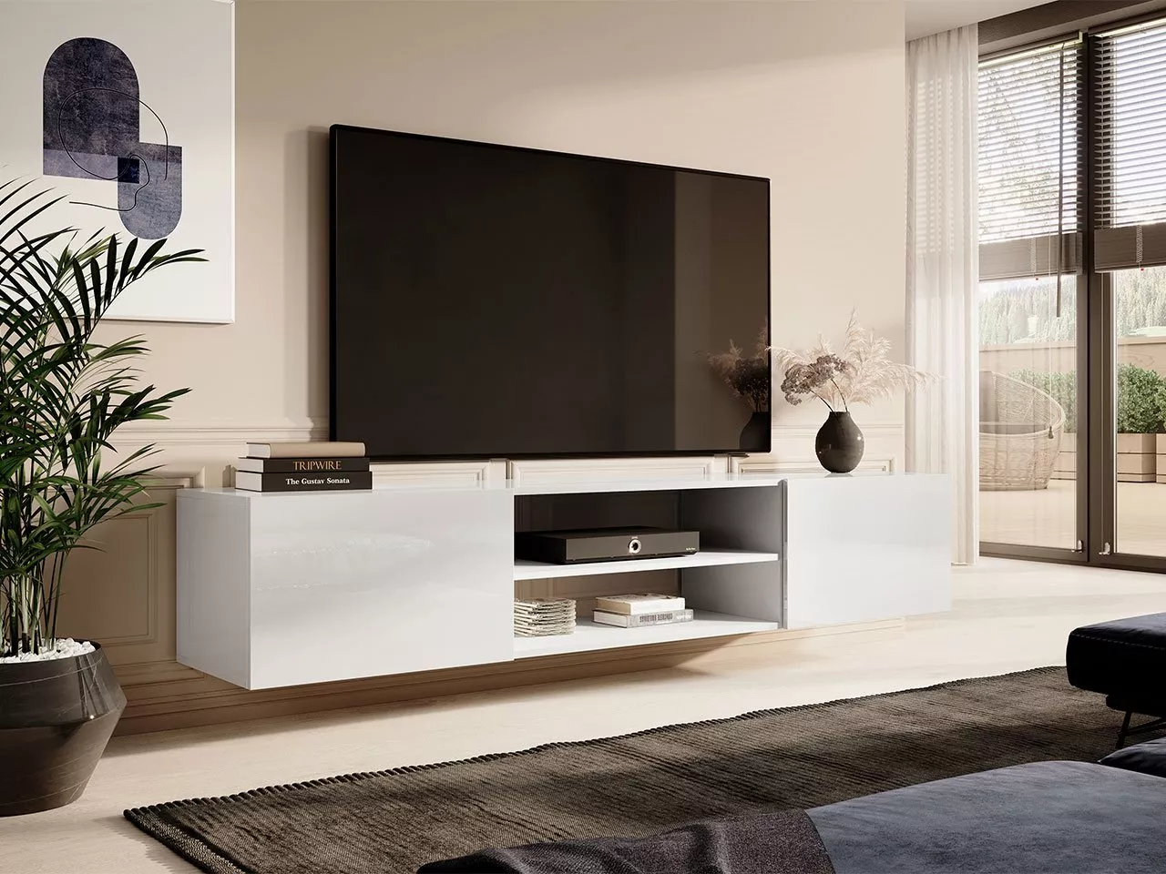 Závěsný TV stolek TOKA je dokonalou kombinací moderního designu a funkčnosti. Horní deska, dvířka a hrany jsou vyrobené ve vysokém lesku, který dokonale odráží světlo a opticky zvětšuje místnost. Za zmínku stojí pohodlný systém otevírání PUSH TO OPEN, který vám usnadní každodenní používání.
