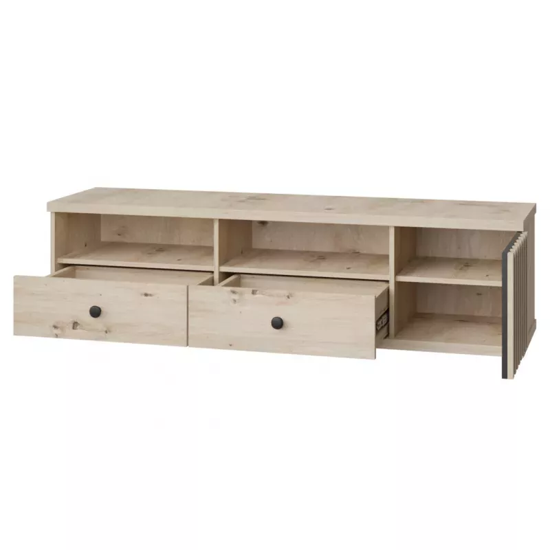 Z hlediska funkčnosti poskytuje stolek dostatek prostoru pro potřebné televizní příslušenství. Otevřené police, zavřená skříňka a zásuvky jsou dokonalým místem pro set-top box, hry, desky a sluchátka.