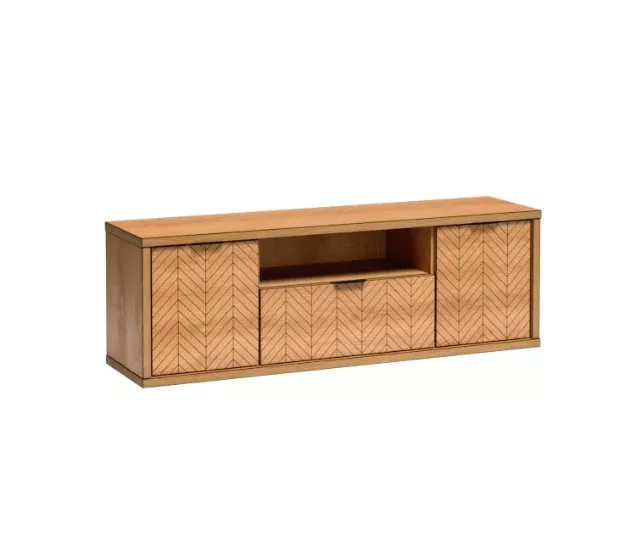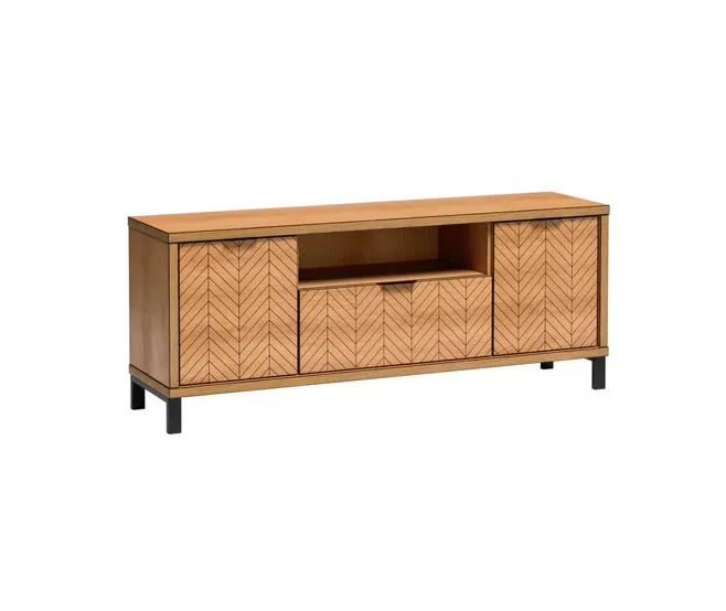 TV stolek DELA tvoří 2 uzavřené skříňky po obou stranách a praktická polička se zásuvkou uprostřed. Charakteristickým znakem stolku jsou dekorativní výřezy na dvířkách a elegantní dekor dubu karamel.