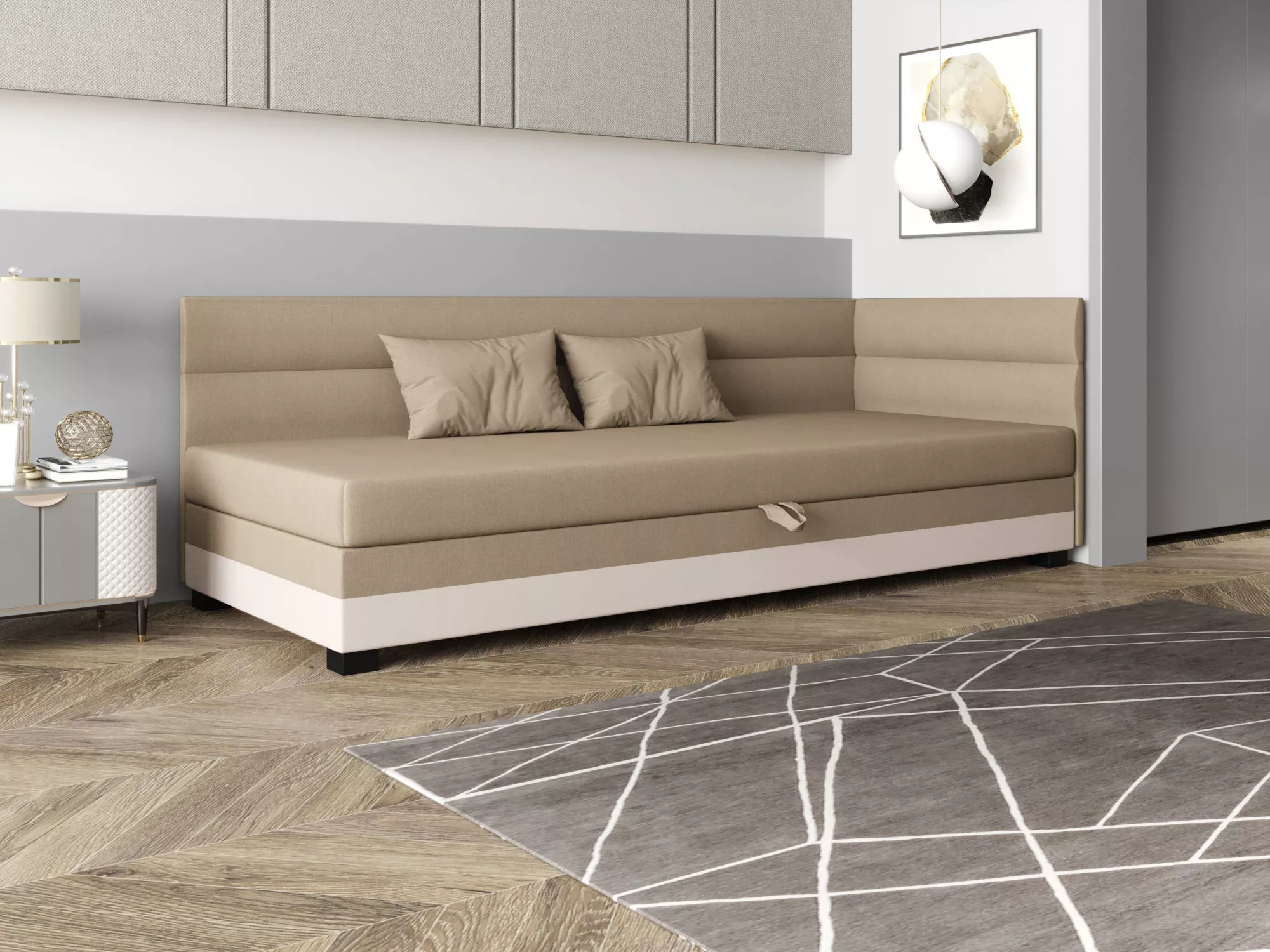 Jednolůžková čalouněná postel 90x195 NALINDA PLUS 2 disponuje prostorným úložným prostorem pro uložení ložního prádla nebo sezónního oblečení. Vysoké čalouněné čelo zpříjemní každou chvílí odpočinku a zabrání poškrábání a zašpinění zdi.