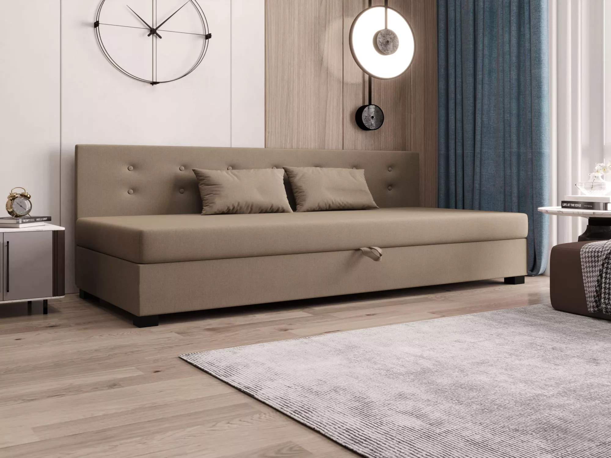 Jednolůžková postel 110x195 AJKA BIZ 1 na první pohled zaujme svým vysokým prošívaným čelem, které zabraňuje poškrábání a zašpinění zdi. Postel skvěle zapadne do každého studentského pokoje. Nechybí ani praktický úložný prostor pro uložení lůžkovin nebo sezónního oblečení.