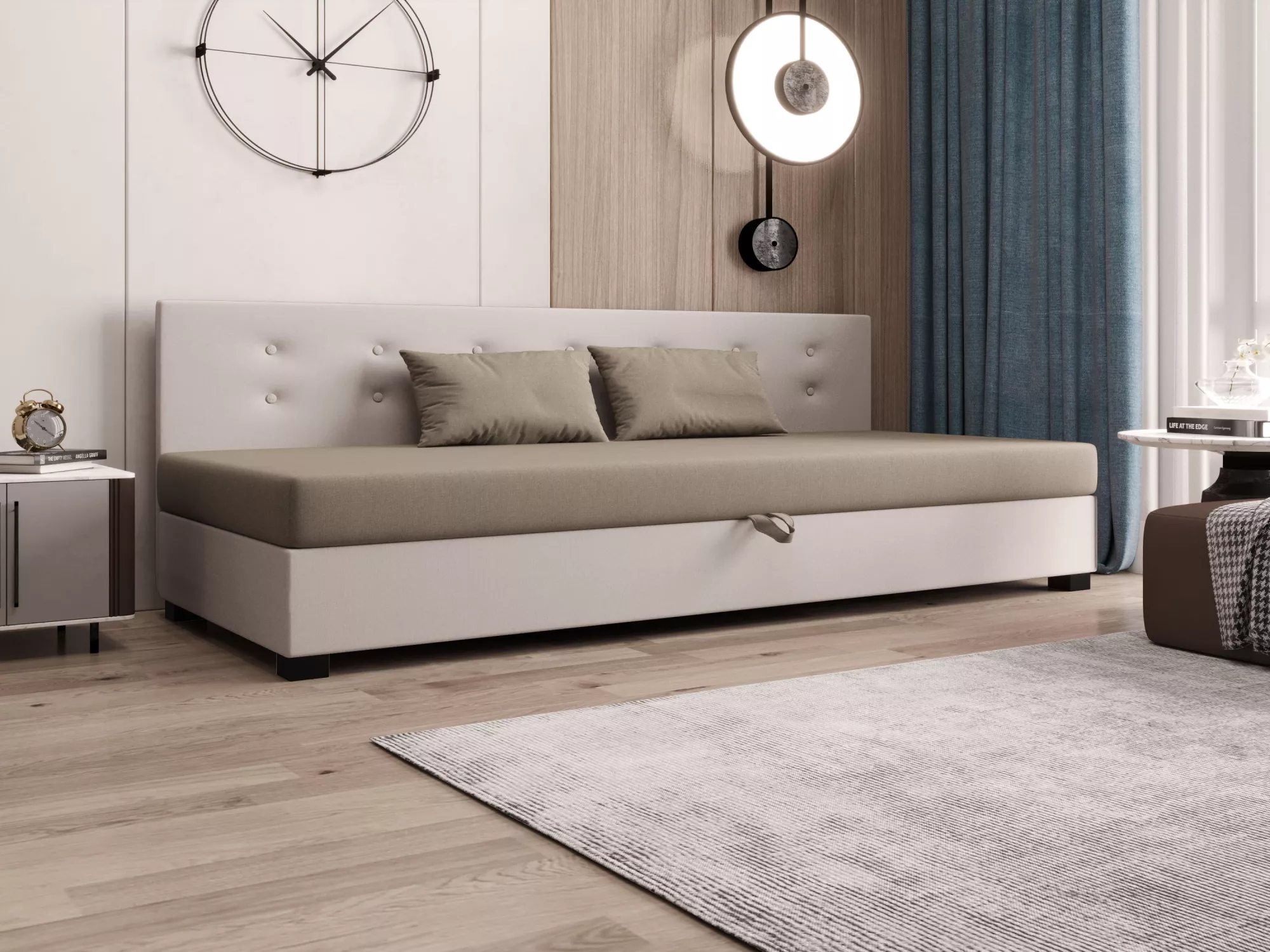 Jednolůžková postel 120x195 AJKA BIZ 2 na první pohled zaujme svým vysokým prošívaným čelem, které zabraňuje poškrábání a zašpinění zdi. Postel skvěle zapadne do každého studentského pokoje. Nechybí ani praktický úložný prostor pro uložení lůžkovin nebo sezónního oblečení.