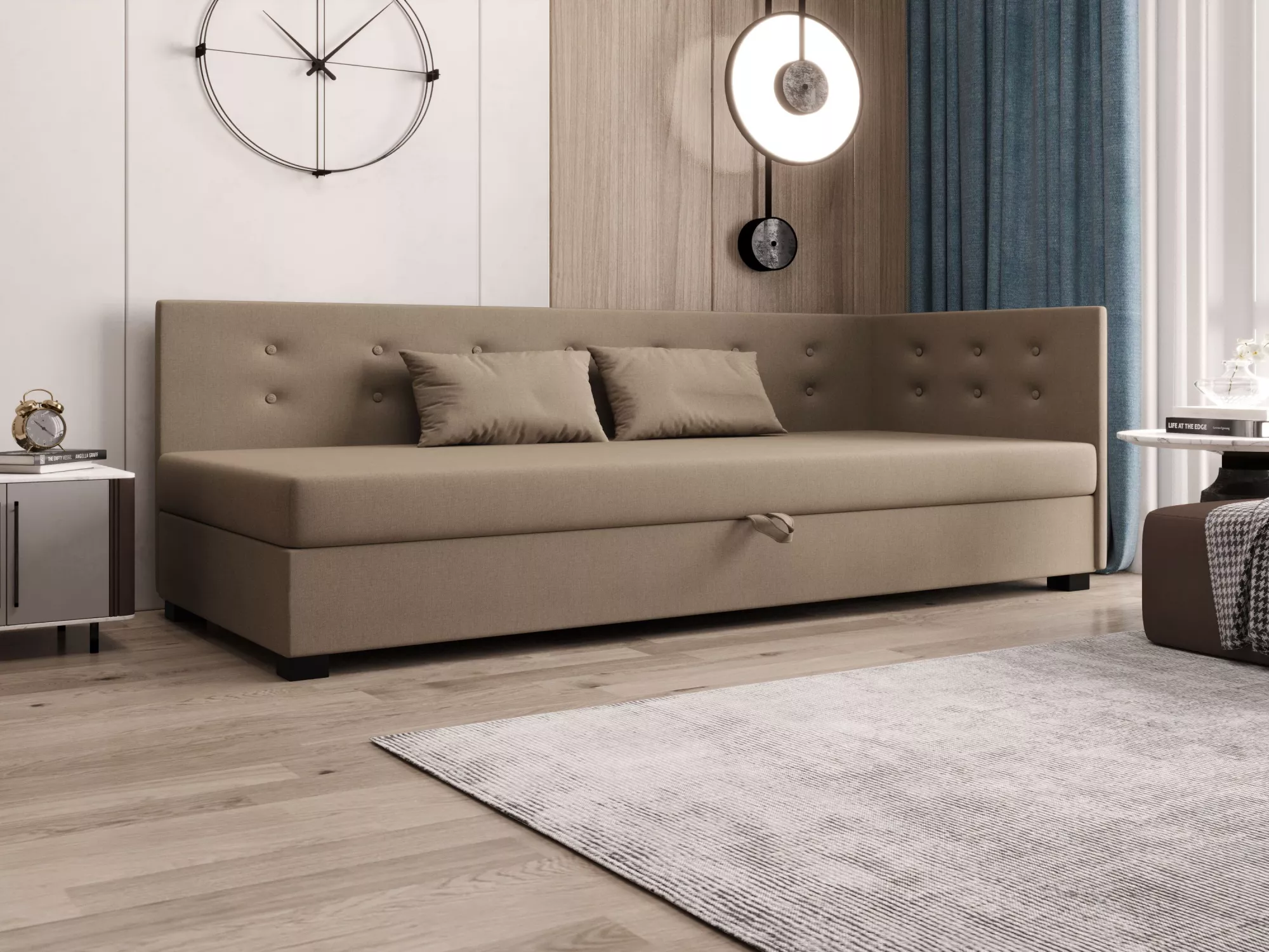 Jednolůžková postel 110x195 AJKA PLUS 1 na první pohled zaujme svým vysokým prošívaným čelem, které zabraňuje poškrábání a zašpinění zdi. Postel skvěle zapadne do každého studentského pokoje. Nechybí ani praktický úložný prostor pro uložení lůžkovin nebo sezónního oblečení.