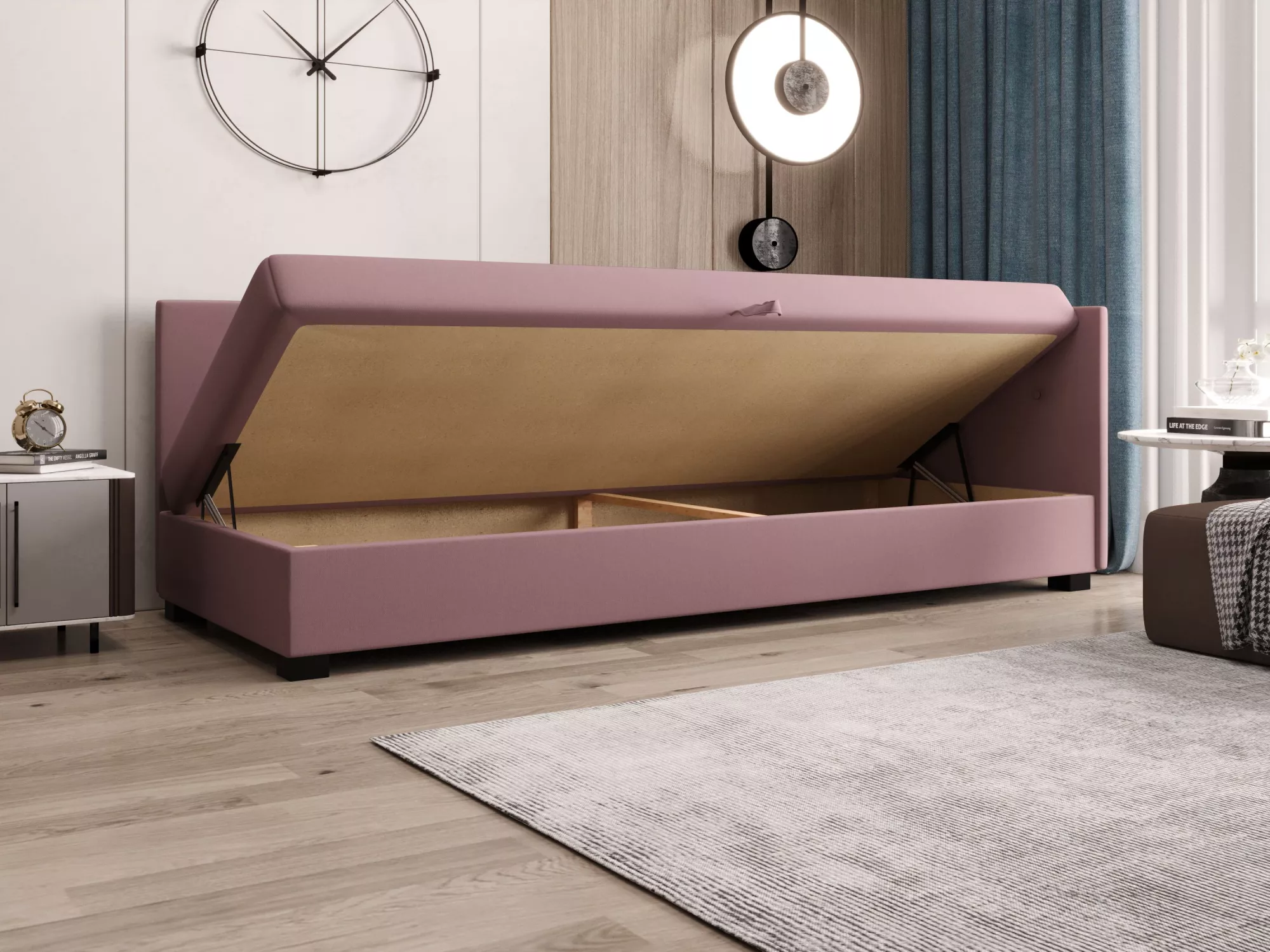 Součástí postele je zabudovaná matrace a úložný prostor.
