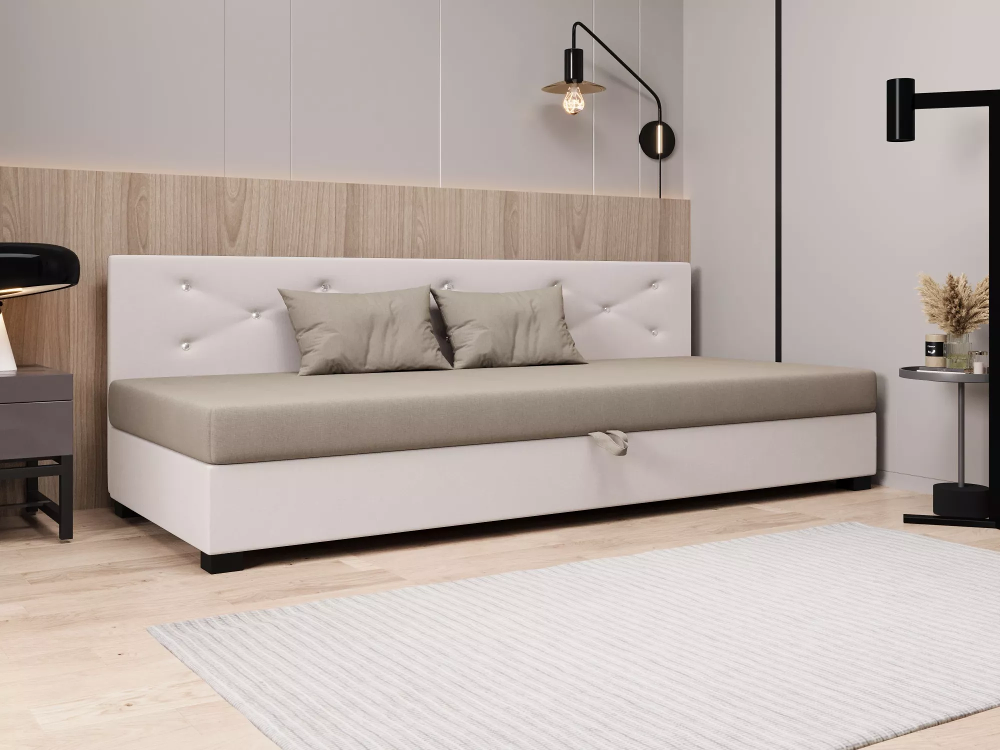 Čalouněná postel 110x195 MILEKA BIZ 1 zaujme především svým prošívaným čelem s ozdobnými knoflíky. Pohodlná matrace poskytne veškerý komfort při odpočinku a relaxaci. Postel disponuje prostorným úložným prostorem, kde můžete schovat lůžkoviny nebo sezónní oblečení.