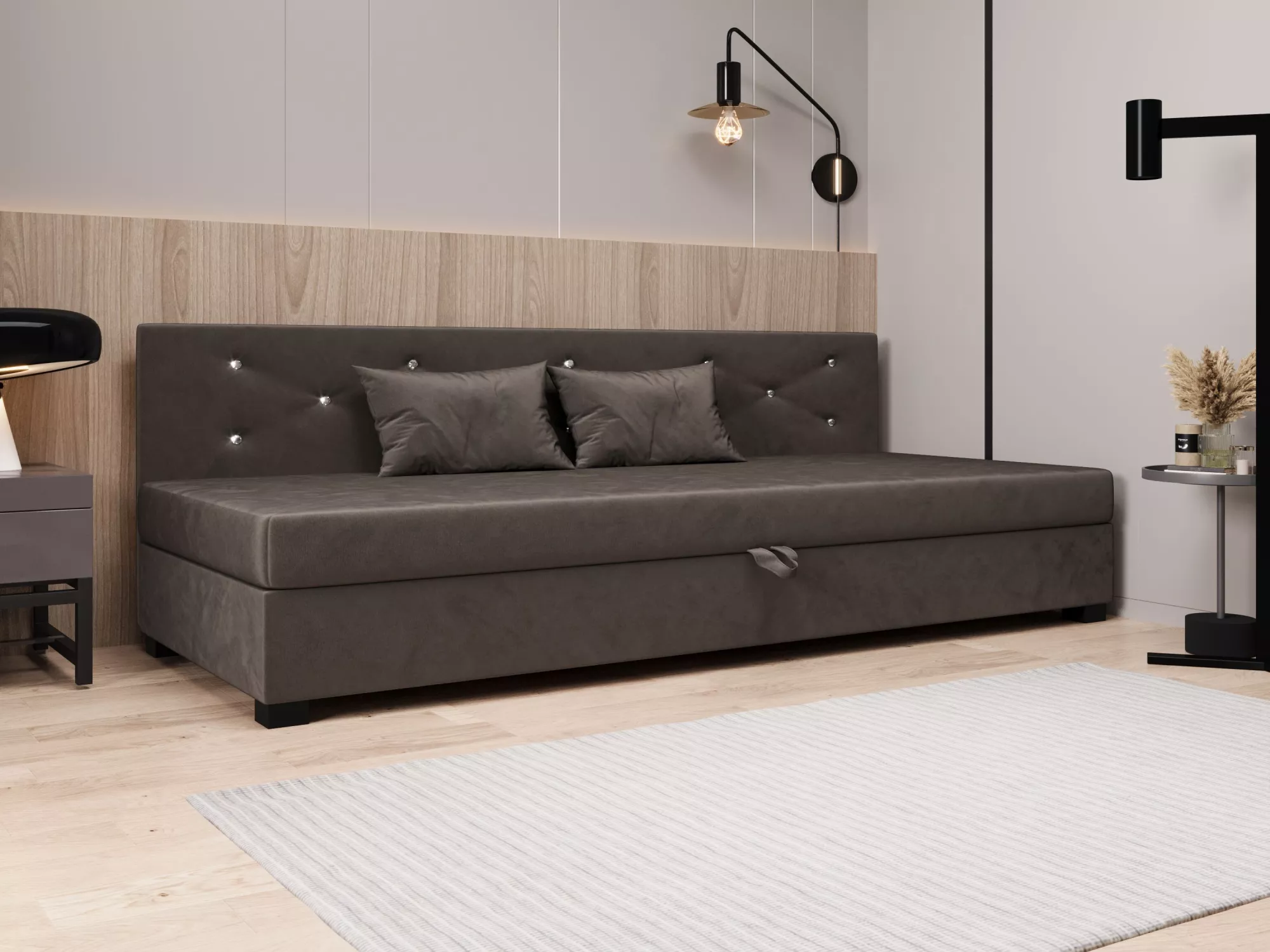 Čalouněná postel 120x195 MILEKA BIZ 1 zaujme především svým prošívaným čelem s ozdobnými knoflíky. Pohodlná matrace poskytne veškerý komfort při odpočinku a relaxaci. Postel disponuje prostorným úložným prostorem, kde můžete schovat lůžkoviny nebo sezónní oblečení.