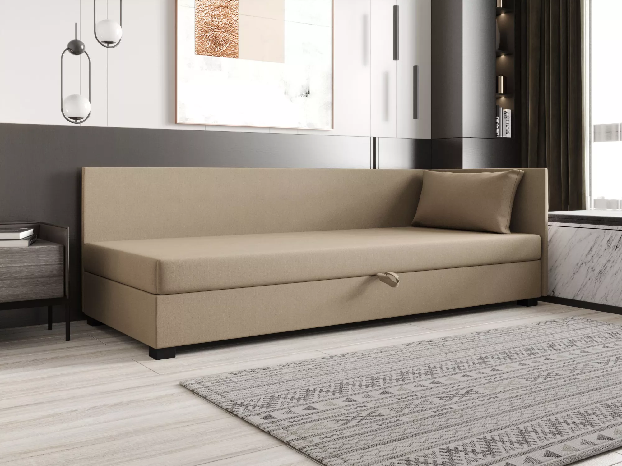 Jednolůžková postel 90x195 ZAJDA PLUS 2 s úložným prostorem svým jednoduchým minimalistickým designem zapadne do každého studentského pokoje. Vysoké čalouněné čelo zabrání poškrábání a zašpinění zdi. Příjemná potahová látka zvýší komfort používání.