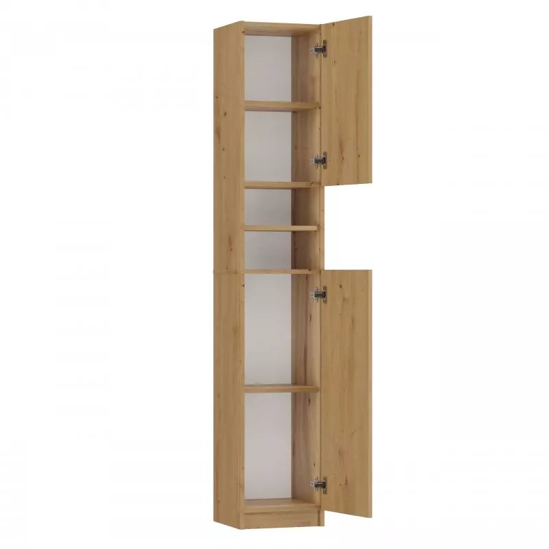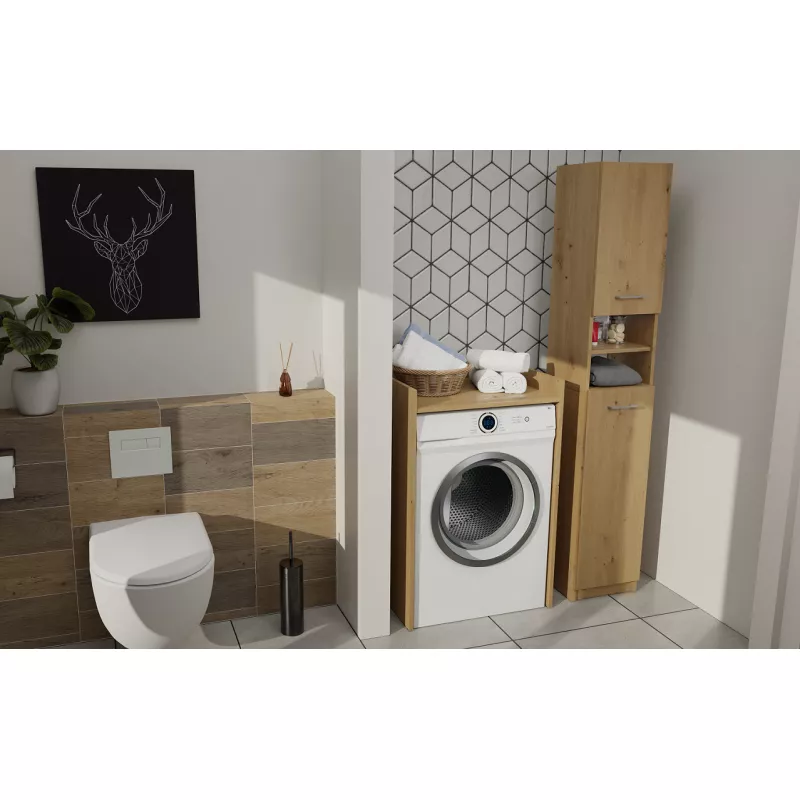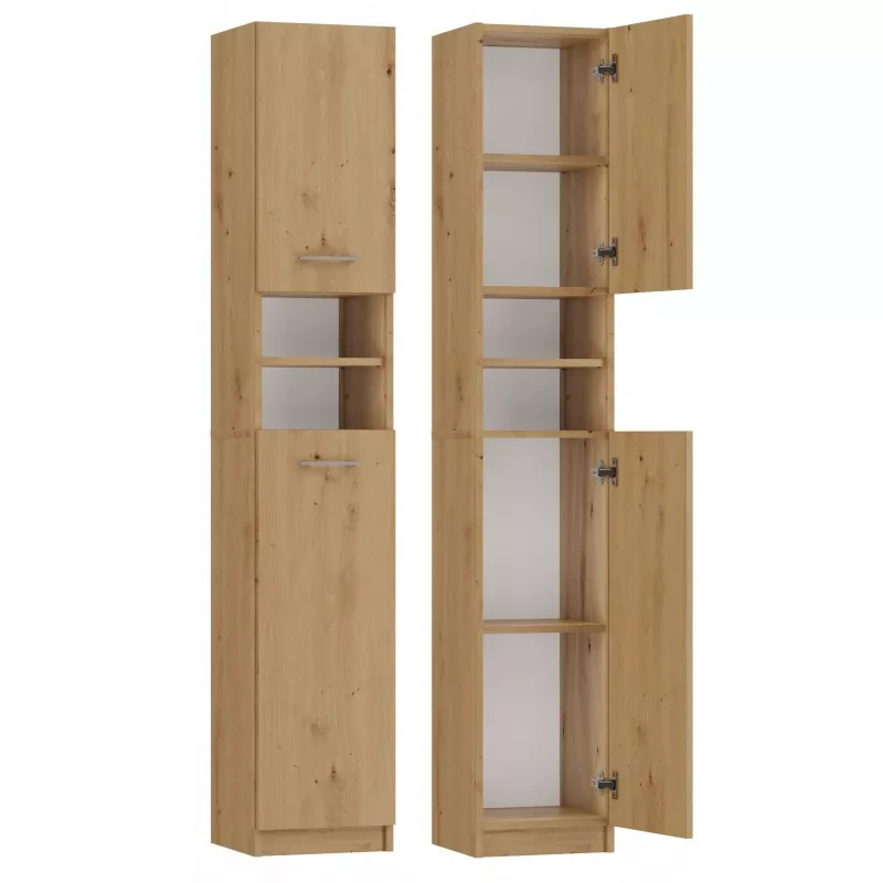 Úzká skříňka do koupelny JANNO vyřešení nedostatek místa v koupelně, kde se počítá každý využitý centimetr. Skříňka je vybavena dostatečným úložným prostorem, kam uschováte kosmetiku, ručníky i všechny nezbytnosti, které do koupelny patří.
