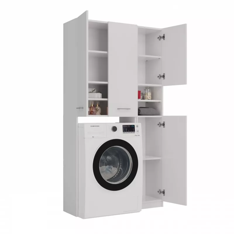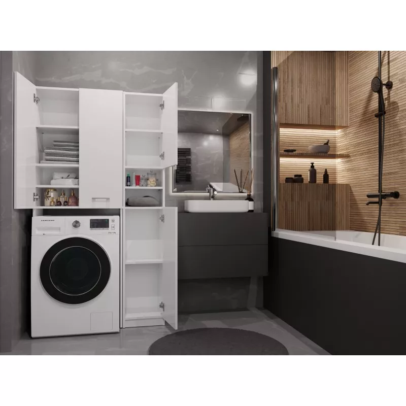 Koupelnová skříňka RISTO 2 vyřešení nedostatek místa v koupelně, kde efektivně využije volného místa nad pračkou. Za dvířky skříněk se nachází prostorné police, které mohou sloužit k uložení pracích prostředků i ručníků, zatímco otevřené poličky mohou sloužit k vystavení kosmetiky.
