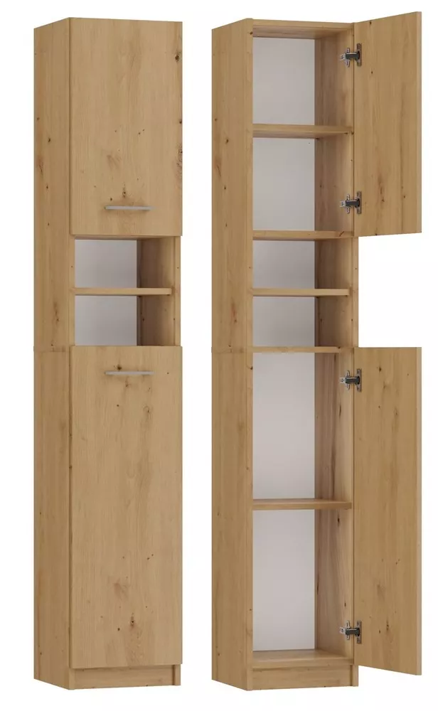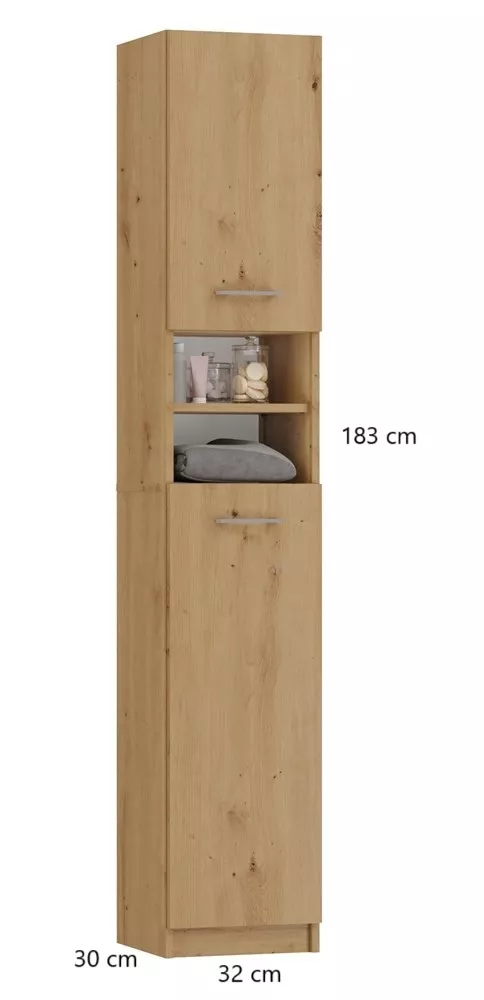 Úzká koupelnová skříňka JANNO vyřešení nedostatek místa v koupelně, kde se počítá každý využitý centimetr. Skříňka je vybavena dostatečným úložným prostorem, kam uschováte kosmetiku, ručníky i všechny nezbytnosti, které do koupelny patří.