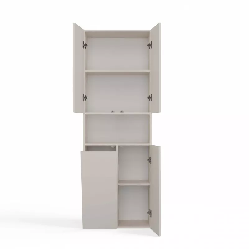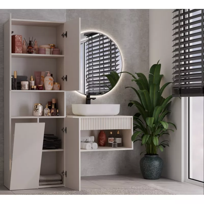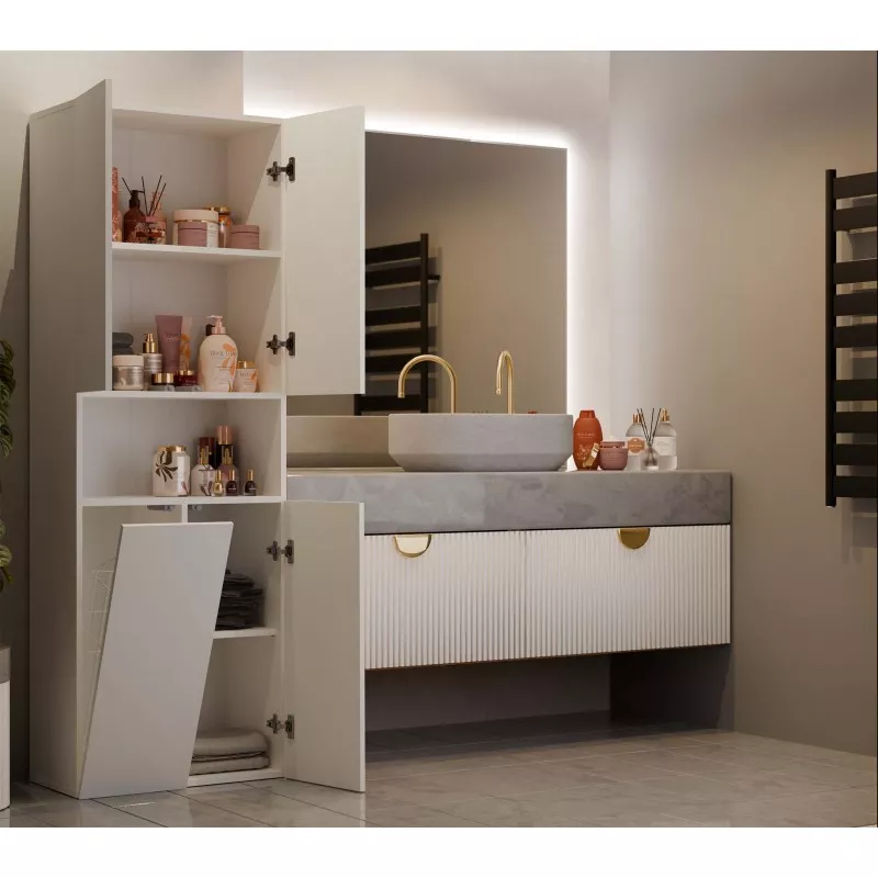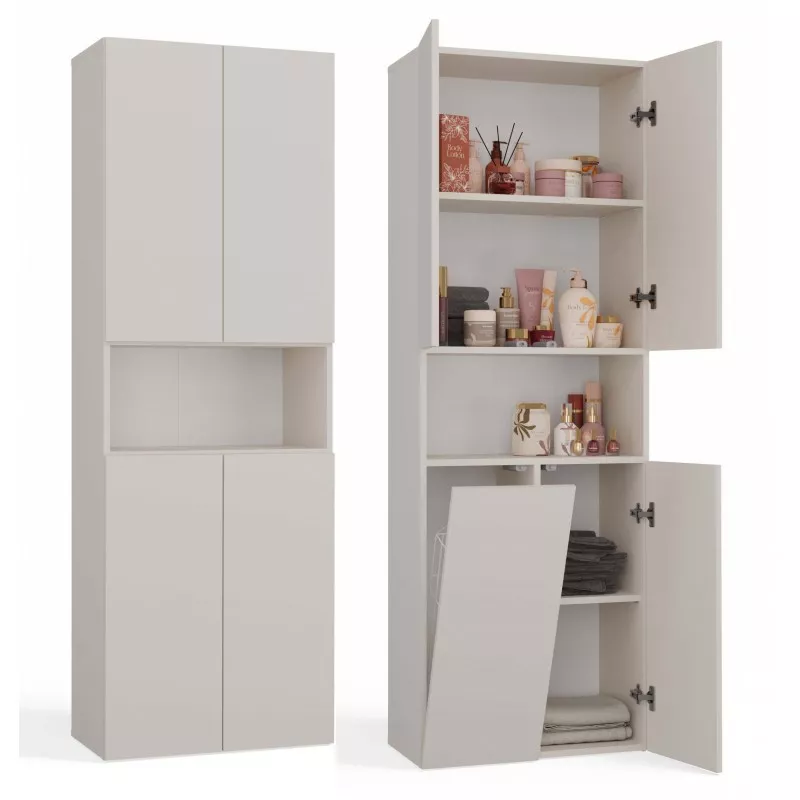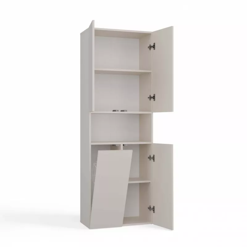 Koupelnová skříňka s košem na prádlo ATSO se vyznačuje obrovskou funkčností a umožňuje pečlivě organizovat prostor v koupelně. Horní část skříňky je vybavena policemi schovanými za dvířky a otevřenou policí, spodní část je zase vybavena praktickým košem na špinavé prádlo a další policovou skříňkou.