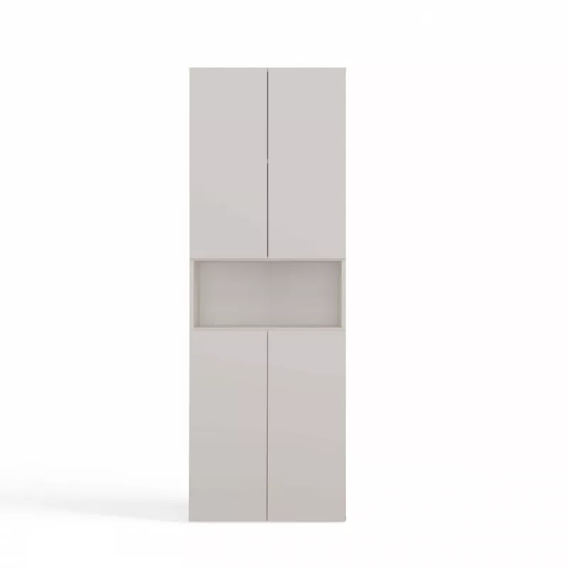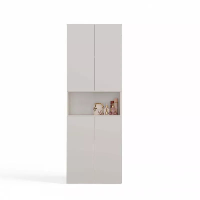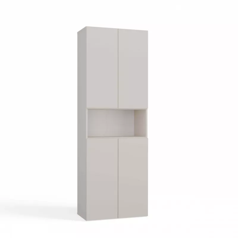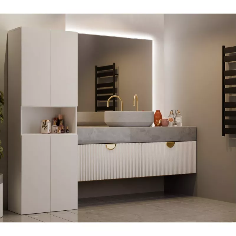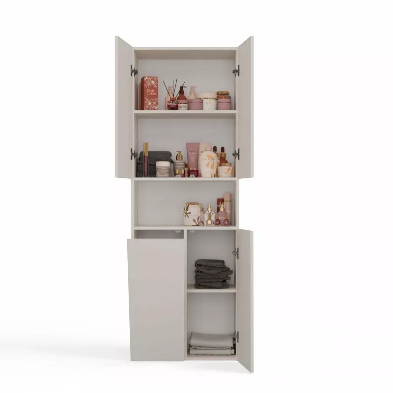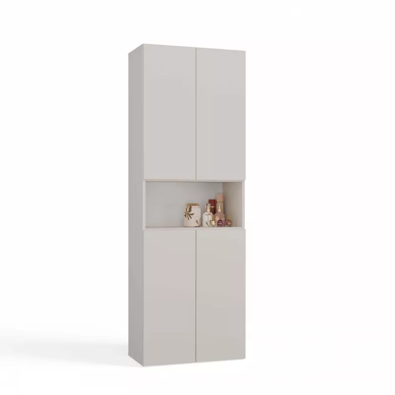 Koupelnová skříňka s košem na prádlo ATSO se vyznačuje obrovskou funkčností a umožňuje pečlivě organizovat prostor v koupelně. Horní část skříňky je vybavena policemi schovanými za dvířky a otevřenou policí, spodní část je zase vybavena praktickým košem na špinavé prádlo a další policovou skříňkou.