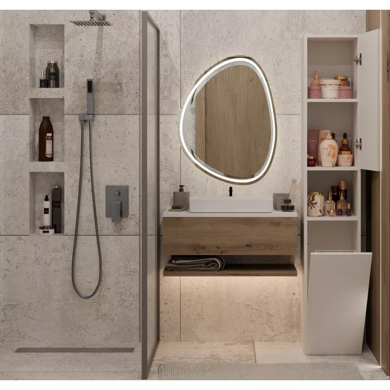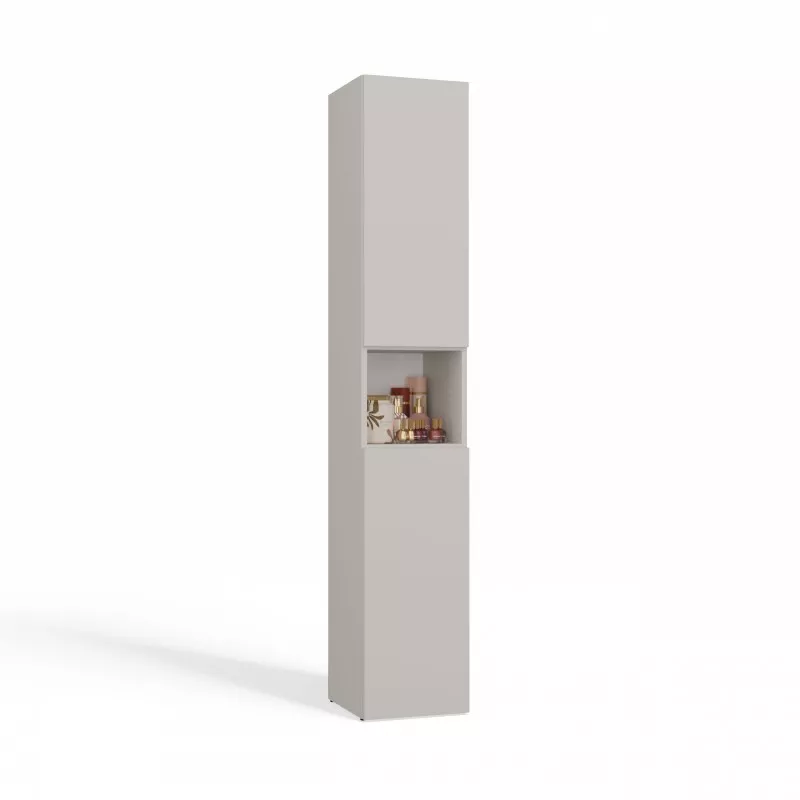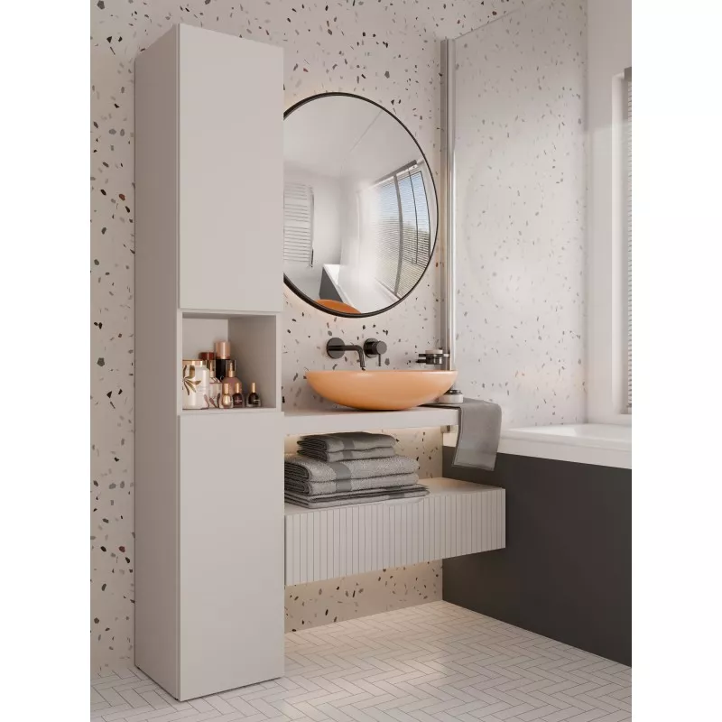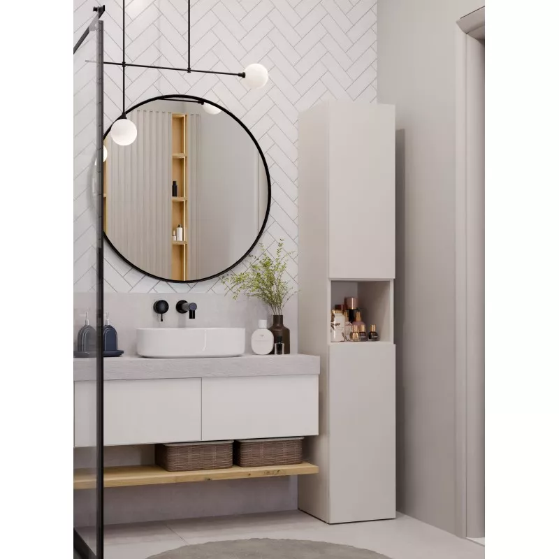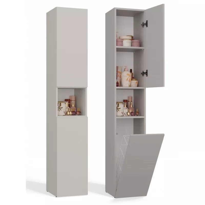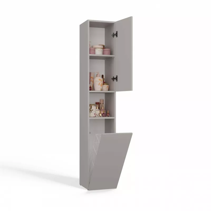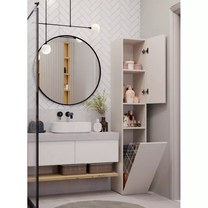 Koupelnová úzká skříňka ATSO se vyznačuje obrovskou funkčností a umožňuje pečlivě organizovat prostor v koupelně. Horní část skříňky je vybavena policemi uschovanými za dvířky a otevřenou poličkou, spodní část je zase vybavena praktickým košem na špinavé prádlo.