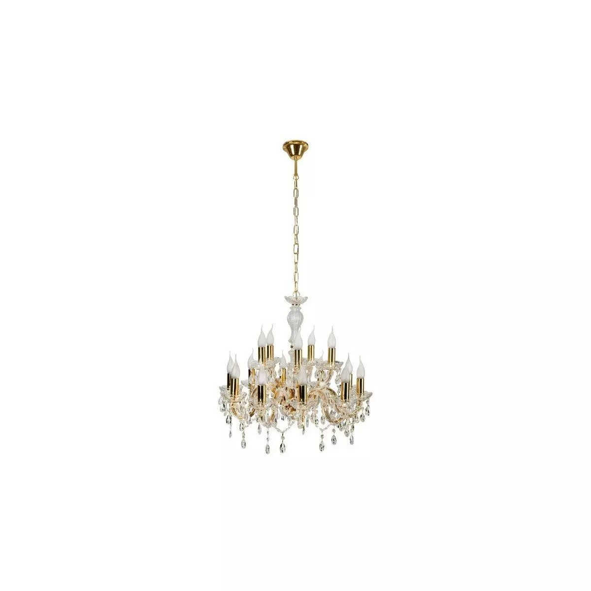 Zkrášlete svůj domov se závěsným svítidlem MARIA TERESA! Zlatá kovová konstrukce s visícími plastovými krystalky vytváří bohatý dekorativní efekt, který evokuje luxus klasického prostoru. Ideální do obývacího pokoje nebo do vstupní haly, kde dodá interiéru impozantní charakter. Určeno pro 15 žárovek s paticí E14 a maximálním výkonem 40 W. Pro úsporu el. energie doporučujeme osadit úspornou LED žárovkou. Krytí IP20 značí vhodnost použití v interiéru.
