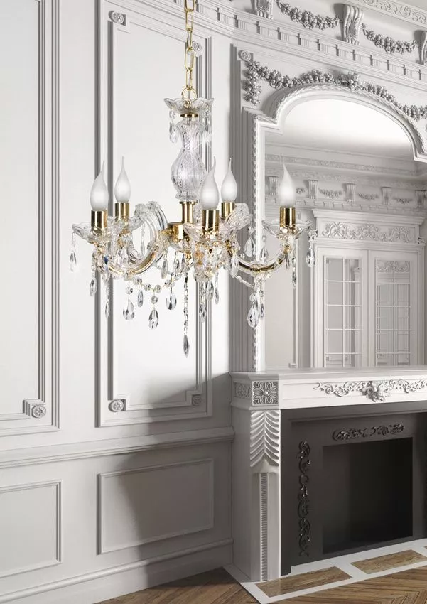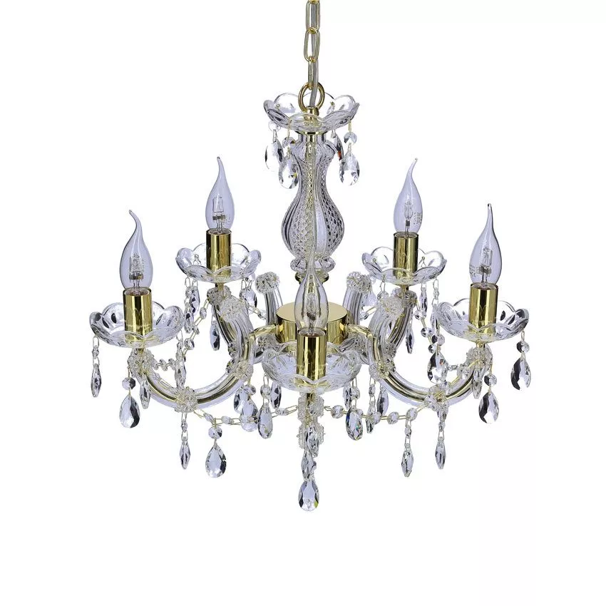 Zkrášlete svůj domov se závěsným svítidlem MARIA TERESA! Zlatá kovová konstrukce s visícími plastovými krystalky vytváří bohatý dekorativní efekt, který evokuje luxus klasického prostoru. Ideální do obývacího pokoje nebo do vstupní haly, kde dodá interiéru impozantní charakter. Určeno pro 5 žárovek s paticí E14 a maximálním výkonem 40 W. Pro úsporu el. energie doporučujeme osadit úspornou LED žárovkou. Krytí IP20 značí vhodnost použití v interiéru.