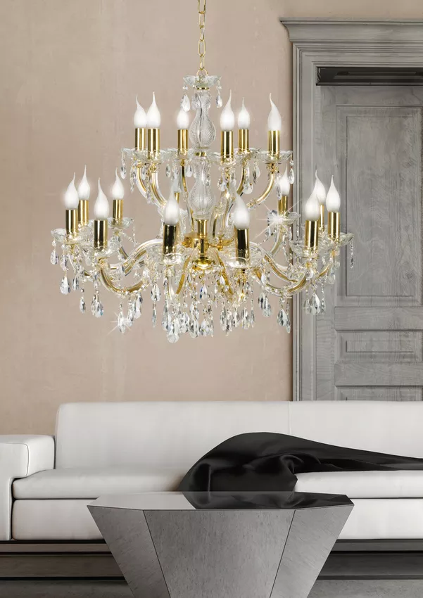 Zkrášlete svůj domov se závěsným svítidlem MARIA TERESA! Zlatá kovová konstrukce s visícími plastovými krystalky vytváří bohatý dekorativní efekt, který evokuje luxus klasického prostoru. Ideální do obývacího pokoje nebo do vstupní haly, kde dodá interiéru impozantní charakter. Určeno pro 9 žárovek s paticí E18 a maximálním výkonem 40 W. Pro úsporu el. energie doporučujeme osadit úspornou LED žárovkou. Krytí IP20 značí vhodnost použití v interiéru.