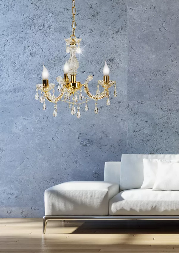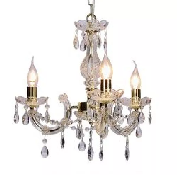 Zkrášlete svůj domov se závěsným svítidlem MARIA TERESA! Zlatá kovová konstrukce s visícími plastovými krystalky vytváří bohatý dekorativní efekt, který evokuje luxus klasického prostoru. Ideální do obývacího pokoje nebo do vstupní haly, kde dodá interiéru impozantní charakter. Určeno pro 3 žárovky s paticí E14 a maximálním výkonem 40 W. Pro úsporu el. energie doporučujeme osadit úspornou LED žárovkou. Krytí IP20 značí vhodnost použití v interiéru.