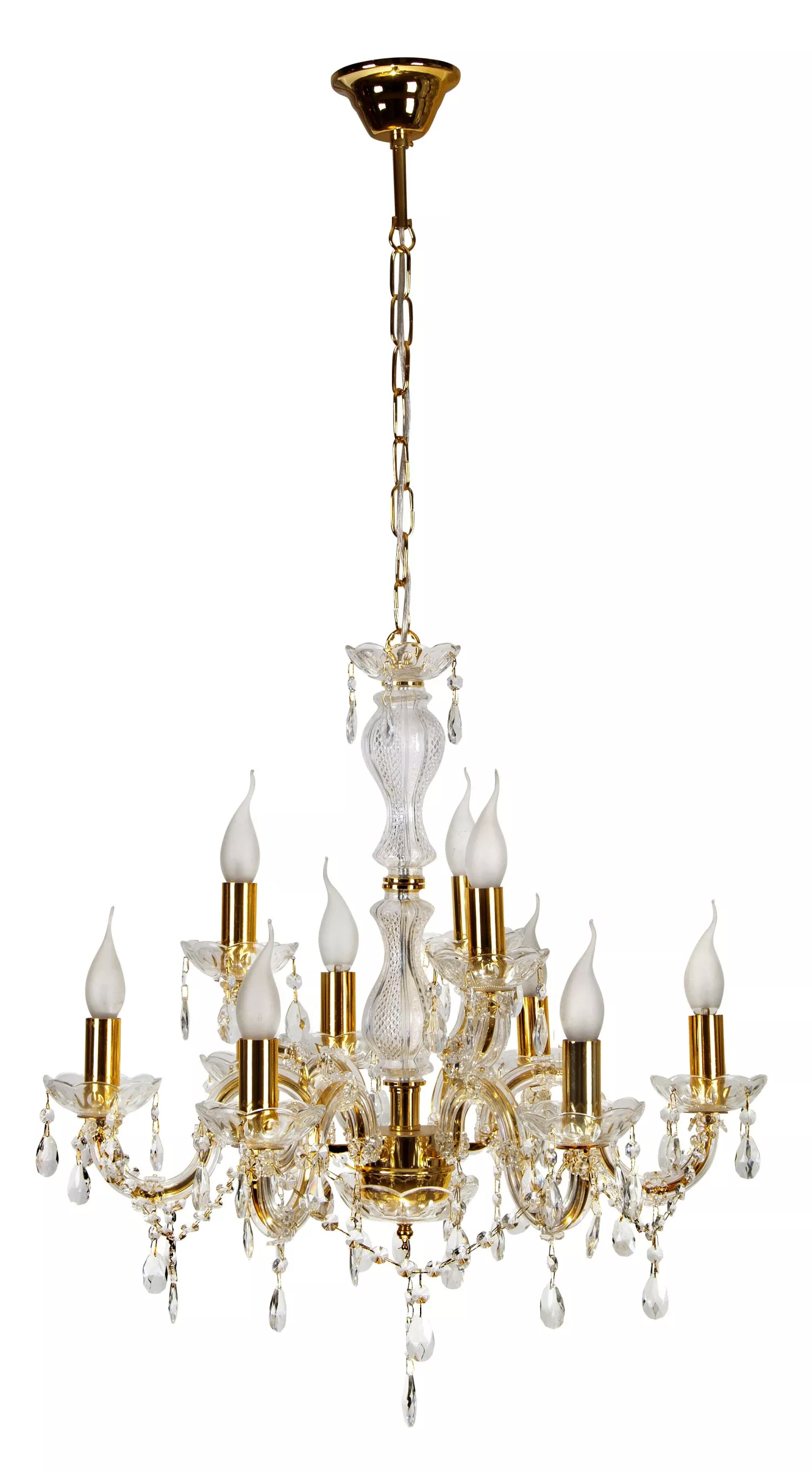 Zkrášlete svůj domov se závěsným svítidlem MARIA TERESA! Zlatá kovová konstrukce s visícími plastovými krystalky vytváří bohatý dekorativní efekt, který evokuje luxus klasického prostoru. Ideální do obývacího pokoje nebo do vstupní haly, kde dodá interiéru impozantní charakter. Určeno pro 9 žárovek s paticí E14 a maximálním výkonem 40 W. Pro úsporu el. energie doporučujeme osadit úspornou LED žárovkou. Krytí IP20 značí vhodnost použití v interiéru.