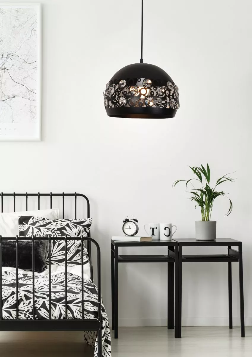 Závěsný designový lustr na lanku JOLINA překvapí odvážným stínidlem se zajímavým prořezávaným vzorem a skleněnými krystalky, které přetvářejí světlo na hru stínů a odlesků. Nejlépe vynikne nad jídelním stolem, v obývacím pokoji nebo ve vstupní hale, kde se stane elegantním dekorativním prvkem. Světlo je osazeno paticí E27 pro žárovku o maximálním příkonu 40 W, která není dodávána v balení. Pro úsporu elektrické energie doporučujeme osadit úspornou LED žárovkou. Krytí IP20 značí vhodnost použití v interiéru.
