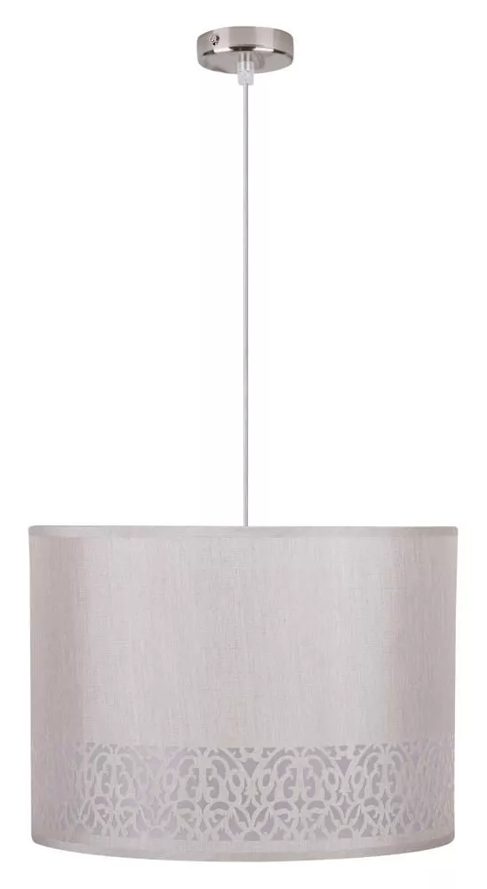 Závěsný moderní lustr ARABESCA disponuje stínidlem z textilní tkaniny kombinované s PCV, které mu dodává jemný vzorovaný akcent. Je osazeno 1 paticí E27 a výborně se uplatní nad jídelním stolem, v obývacím pokoji nebo v prostorách s otevřeným stropem. Pro úsporu elektrické energie doporučujeme osadit úspornou LED žárovkou. Krytí IP20 značí vhodnost použití v interiéru.