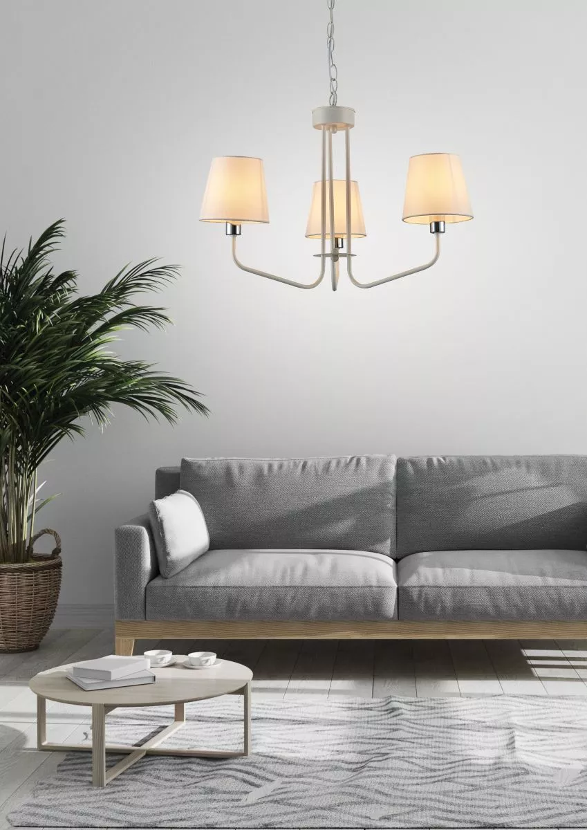 Vneste do interiéru svěžest s moderním závěsným svítidlem LUMINOR! Kovová konstrukce v bílé barvě a minimalistická stínidla vytvářejí čistý, lehký design zavěšený na dekorativním řetězu. Ideální volba do obývacího pokoje nebo stylové kanceláře. Určeno pro 3 žárovky s paticí E14 a maximálním výkonem 60 W. Pro úsporu el. energie doporučujeme osadit úspornou LED žárovkou. Krytí IP20 značí vhodnost použití v interiéru.