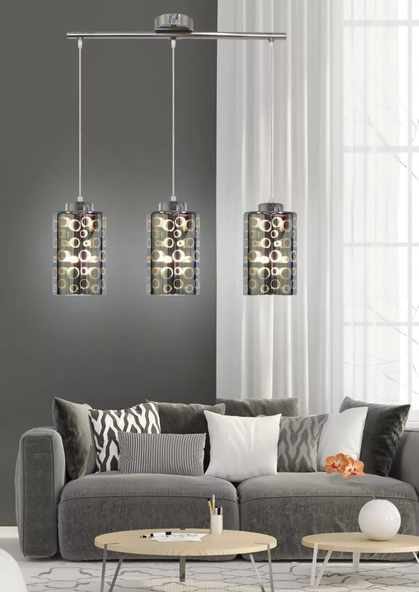 Zvýrazněte svůj interiér se závěsným svítidlem NOCTURNO! Kovová konstrukce v lesklém chromovaném provedení doplňuje originální stínidla, která po rozsvícení vytvářejí fascinující 3D efekt a hru světla a stínu. Ideální nad jídelní stůl, kde dodá prostoru nádech luxusu. Určeno pro 3 žárovky s paticí E27 a maximálním výkonem 40 W. Pro úsporu el. energie doporučujeme osadit úspornou LED žárovkou. Krytí IP20 značí vhodnost použití v interiéru.