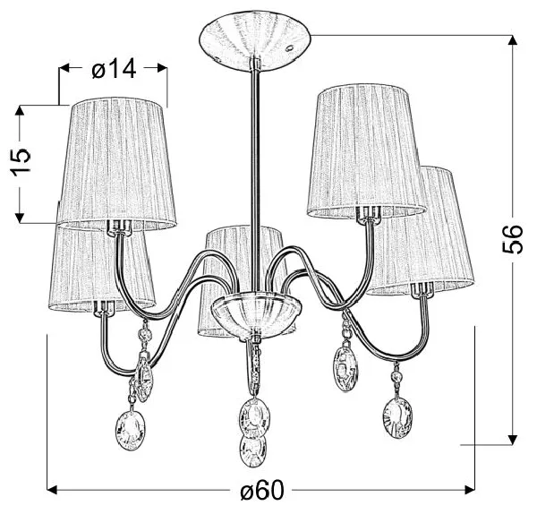 Zvýrazněte eleganci svého interiéru se závěsným osvětlením SORENTO! Patinovaná kovová konstrukce v kombinaci s bílými textilními stínidly a dekorativními plastovými krystalky na každém rameni vytváří sofistikovaný a noblesní prvek pro váš domov. Skvělé nad jídelní stůl, do obývacího pokoje nebo do vstupní haly, kde dodá prostoru luxusní atmosféru. Určeno pro 5 žárovek s paticí E14 a maximálním výkonem 40 W. Pro úsporu elektrické energie doporučujeme osadit úspornou LED žárovkou. Krytí IP20 značí vhodnost použití v interiéru.