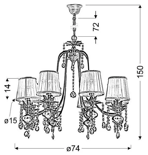 Dodejte svému interiéru nadčasový šarm s osvětlením ADONIS! Osmiramenná konstrukce s výrazným tvarem, textilními stínidly a zavěšenými plastovými křišťálovými detaily vytváří elegantní centrální prvek pro prostorný obývací pokoj či vstupní halu. Určeno pro 8 žárovek s paticí E14 a maximálním výkonem 40 W. Pro úsporu el. energie doporučujeme osadit úspornou LED žárovkou. Krytí IP20 značí vhodnost použití v interiéru.