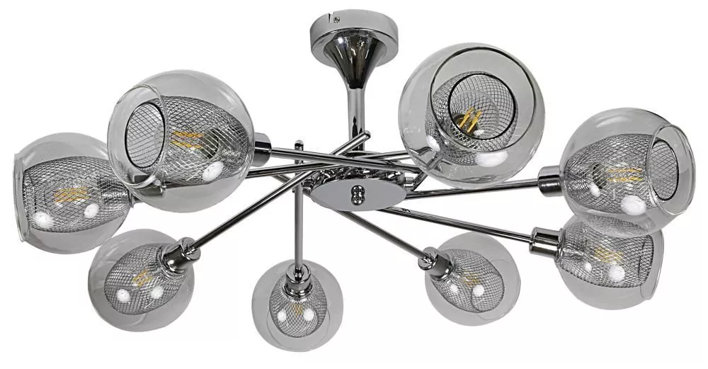 Zkrášlete svůj interiér se závěsným svítidlem OZZO! Čirá skleněná stínidla s kovovým vnitřním košem rozptylují světlo do všech stran a vytvářejí jemnou, vyváženou atmosféru. Skvěle se hodí do ložnice nebo pracovny, kde podtrhne moderní charakter prostoru. Určeno pro 8 žárovek s paticí E14 a maximálním výkonem 40 W. Pro úsporu elektrické energie doporučujeme osadit úspornou LED žárovkou. Krytí IP20 značí vhodnost použití v interiéru.