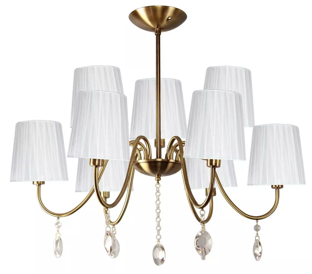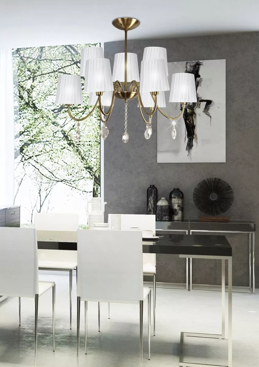 Zvýrazněte eleganci svého interiéru se závěsným svítidlem SORENTO! Patinovaná kovová konstrukce v kombinaci s bílými textilními stínidly a dekorativními plastovými krystalky na každém rameni vytváří sofistikovaný a noblesní prvek pro váš domov. Skvělé nad jídelní stůl, do obývacího pokoje nebo do vstupní haly, kde dodá prostoru luxusní atmosféru. Určeno pro 9 žárovek s paticí E14 a maximálním výkonem 40 W. Pro úsporu elektrické energie doporučujeme osadit úspornou LED žárovkou. Krytí IP20 značí vhodnost použití v interiéru.