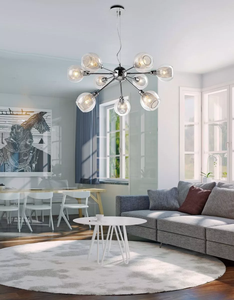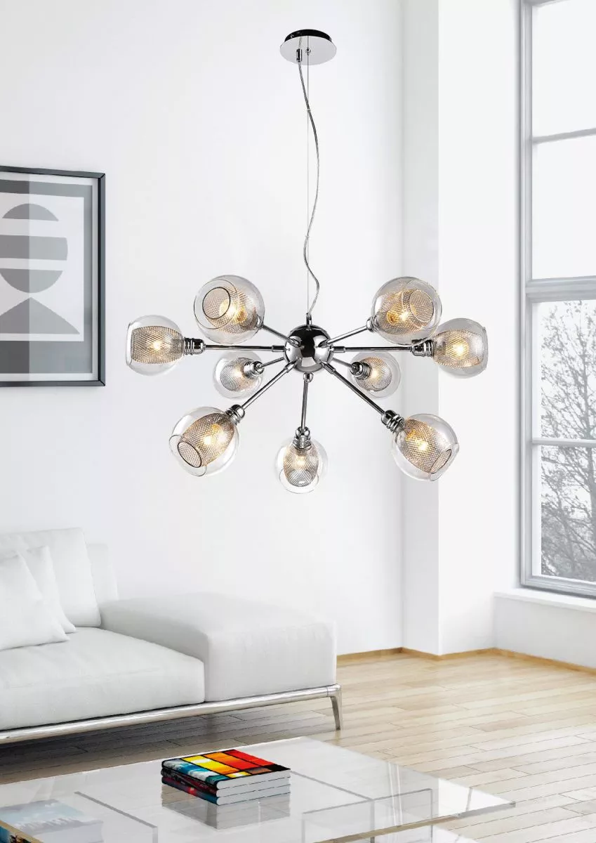 Dodejte svému stropu moderní třpyt s designovým osvětlením DIXI, jehož dynamická, víceramenná konstrukce okamžitě upoutá pozornost. Chromovaná konstrukce drží 9 žárovek a je elegantně zdobena čirými skleněnými stínidly, které maximalizují odraz světla. Toto svítidlo je ideální jako hlavní osvětlení do obývacího pokoje, haly nebo ložnice, kde vytvoří luxusní a zářivou atmosféru. Určeno pro 9 žárovek s paticí E14 a maximálním výkonem 40 W. Pro úsporu el. energie doporučujeme osadit úspornou LED žárovkou. Krytí IP20 značí vhodnost použití v interiéru.