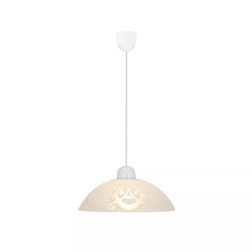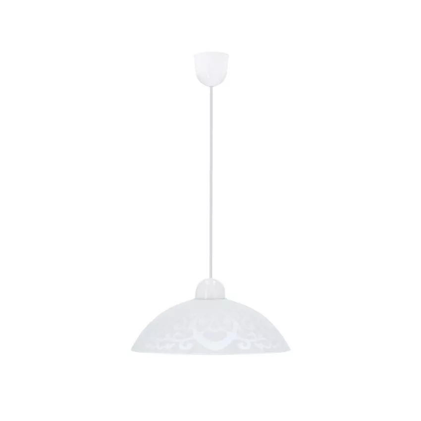 Objevte stylové osvětlení BRONTE – elegantní závěsné svítidlo s bílým skleněným stínidlem zdobeným jemným vzorem. Vhodné pro zavěšení nad jídelní stůl, v obývacím pokoji nebo v klidovém koutku ložnice, kde vytvoří jemný a vyvážený světlý akcent. Určeno pro žárovku s paticí E27 a maximálním výkonem 60 W. Pro úsporu el. energie doporučujeme osadit úspornou LED žárovkou. Krytí IP20 značí vhodnost použití v interiéru.