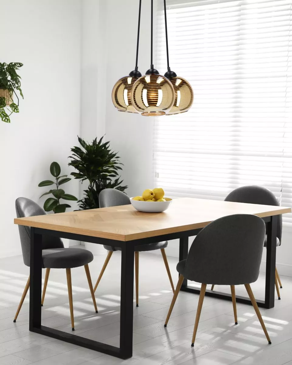 Dodejte svému domovu eleganci se závěsným osvětlením RUBEAM! Kovová konstrukce v černém provedení s lesklými zlatými stínidly vytváří působivou hru odrazů a světla. Ideální nad jídelní stůl nebo do obývacího pokoje, kde promění interiér v stylový celek. Určeno pro 3 žárovky s paticí E27 a maximálním výkonem 60 W. Pro úsporu el. energie doporučujeme osadit úspornou LED žárovkou. Krytí IP20 značí vhodnost použití v interiéru.