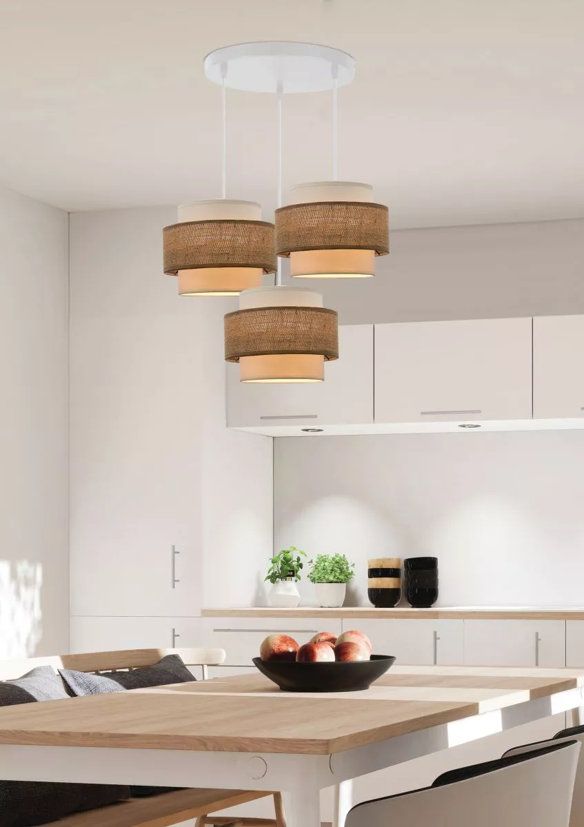 Vneste do interiéru klid a přirozenou krásu se závěsným svítidlem JUTA. Látková stínidla působí lehce a vytváří hřejivou atmosféru s nádechem skandinávské jednoduchosti. Skvěle se hodí do ložnice nebo nad jídelní stůl. Určeno pro 3 žárovky s paticí E27 a maximálním výkonem 40 W. Pro úsporu el. energie doporučujeme osadit úspornou LED žárovkou. Krytí IP20 značí vhodnost použití v interiéru.