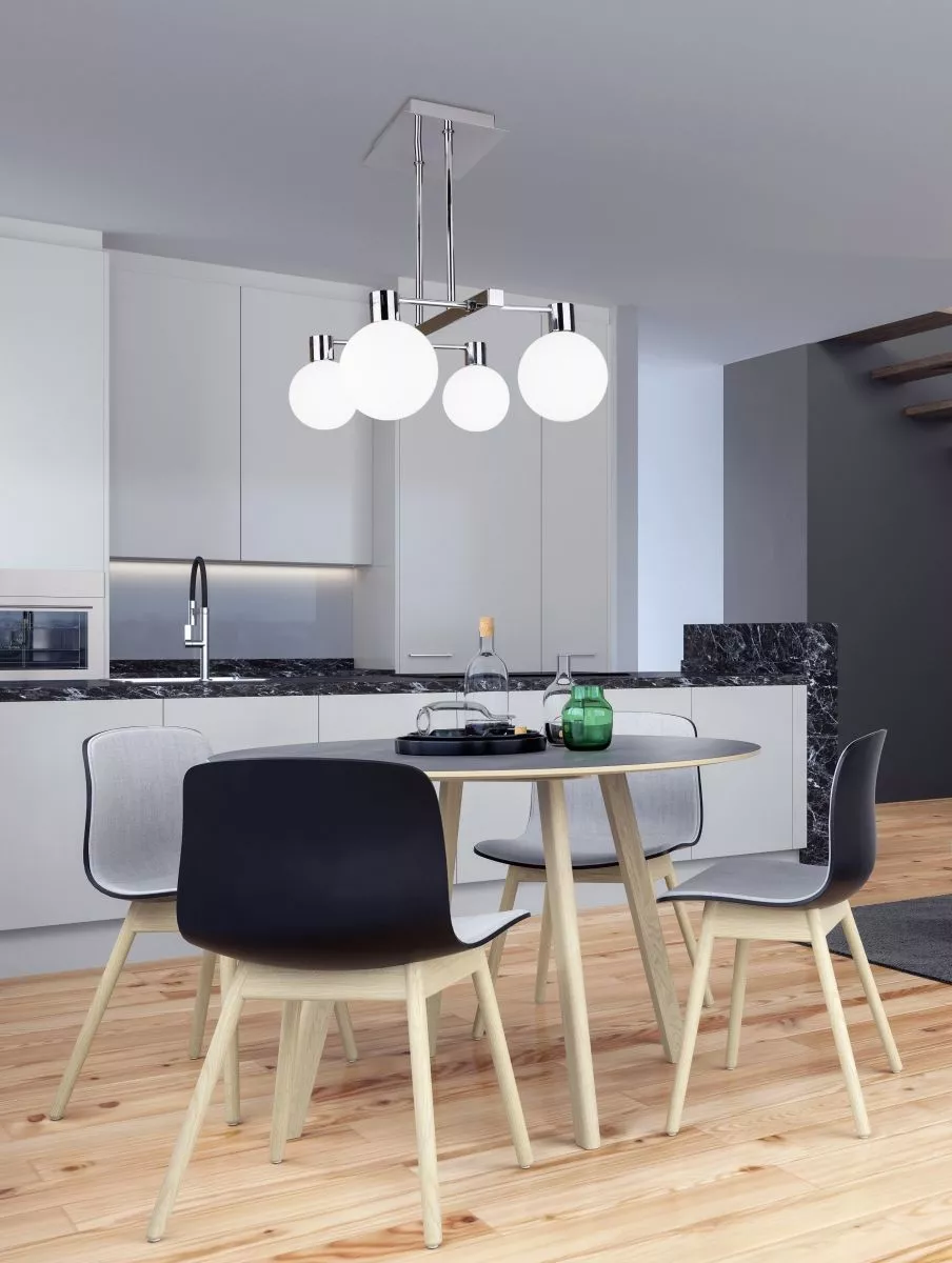 Zkrášlete svůj domov se závěsným osvětlením MALDUS! Kovová konstrukce v chromovaném provedení s bílými stínidly působí čistě a elegantně. Ideální nad jídelní stůl, kde se stane středobodem prostoru a dodá interiéru rafinovaný charakter. Určeno pro 4 žárovky s paticí G9 a maximálním výkonem 40 W. Pro úsporu el. energie doporučujeme osadit úspornou LED žárovkou. Krytí IP20 značí vhodnost použití v interiéru.