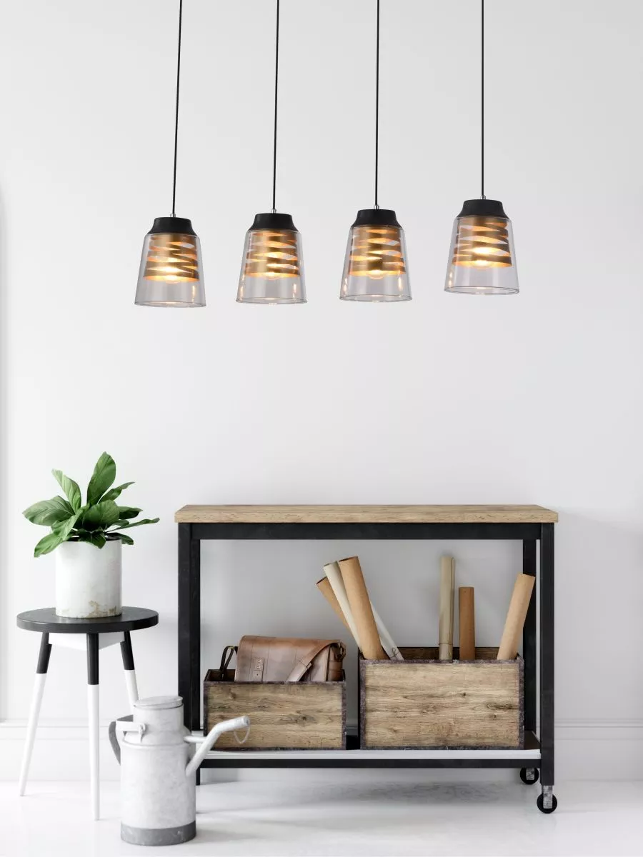 Vytvořte v interiéru výjimečný světelný prvek se svítidlem FRESNO! Čirá skleněná stínidla se zlatou stuhou uvnitř dodávají prostoru jedinečný styl a zajišťují bohatý světelný efekt všemi směry. Skvěle se hodí nad jídelní stůl. Určeno pro 4 žárovky s paticí E27 a maximálním výkonem 60 W. Pro úsporu el. energie doporučujeme osadit úspornou LED žárovkou. Krytí IP20 značí vhodnost použití v interiéru.