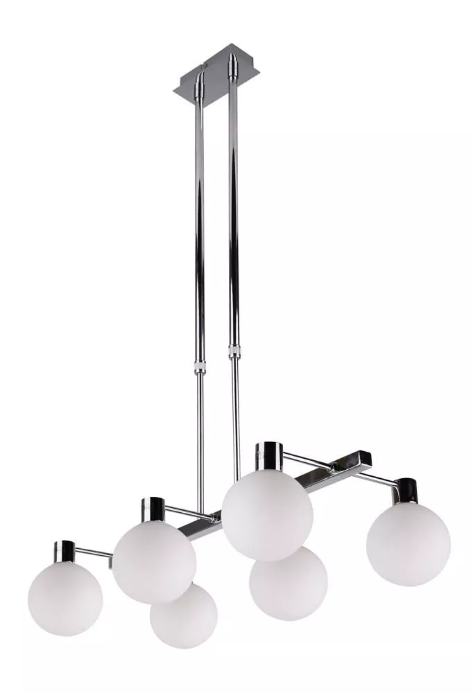 Zkrášlete svůj domov se závěsným svítidlem MALDUS! Kovová konstrukce v chromovaném provedení s bílými stínidly působí čistě a elegantně. Ideální nad jídelní stůl, kde se stane středobodem prostoru a dodá interiéru rafinovaný charakter. Určeno pro 6 žárovek s paticí G9 a maximálním výkonem 40 W. Pro úsporu el. energie doporučujeme osadit úspornou LED žárovkou. Krytí IP20 značí vhodnost použití v interiéru.
