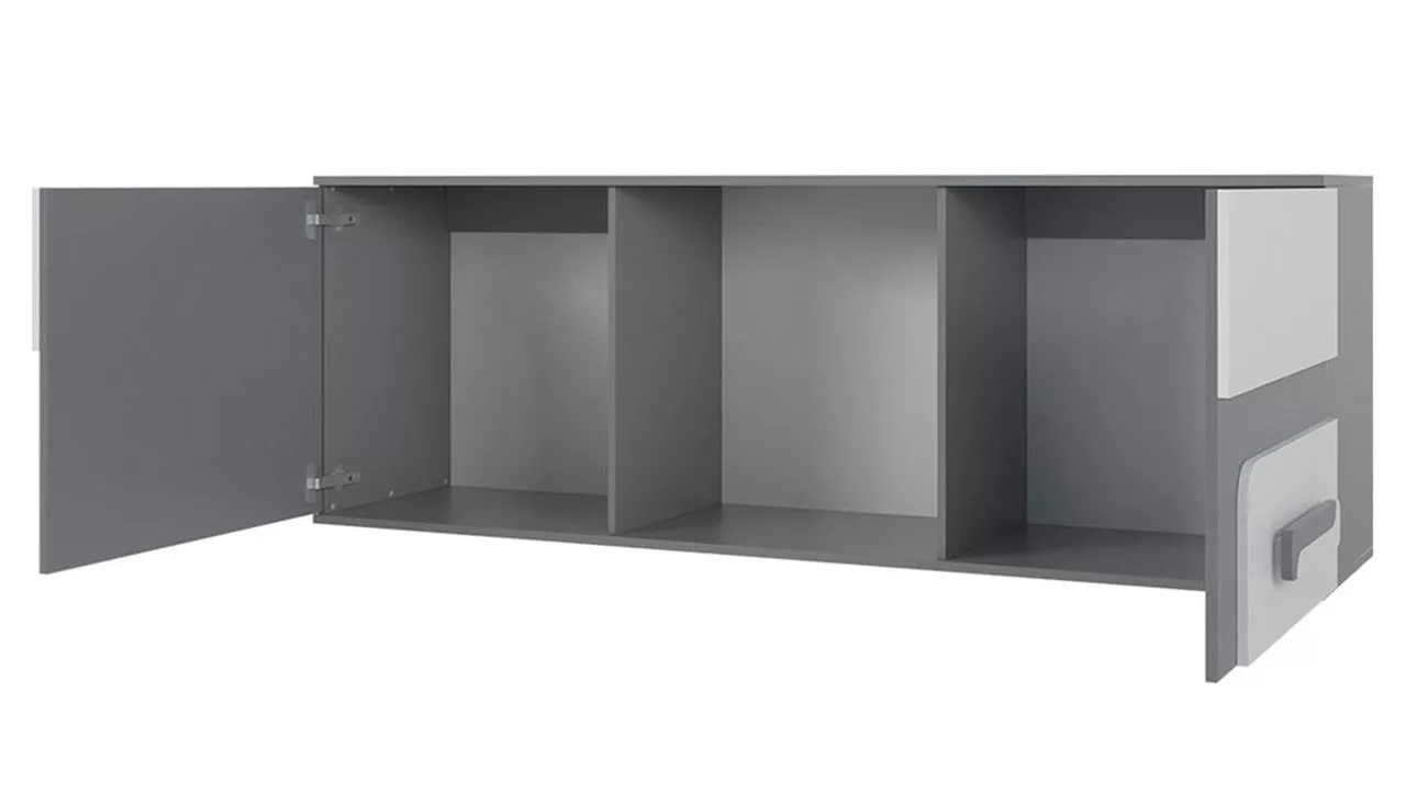 Závěsná police CHOCHO je určená do dětských a studentských pokojů. Má charakteristická čela, zajímavé úchyty a barevné vložky. Je vybavena dvěma uzavíratelnými skříňkami a otevřenou policí. Police je vyrobena z odolné LTD desky, která zaručuje dlouhodobou spokojenost a bezpečnost.