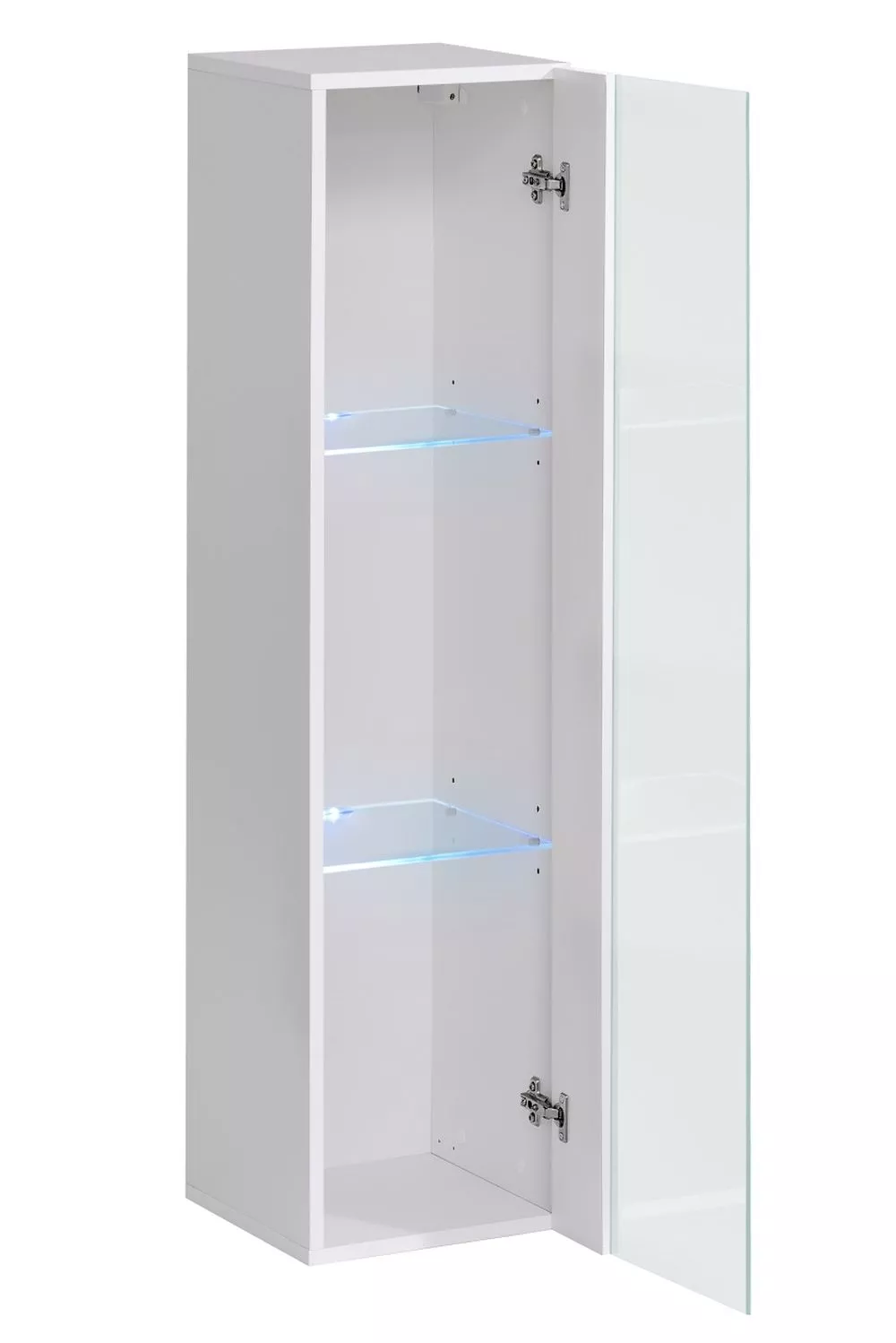Nábytek je ideálním řešením pro lidi, kteří oceňují jednoduchá, funkční a elegantní řešení. Produkty ze série Rionata budou dokonalým doplňkem zařízení vašeho domova, dodají svěžest a moderní vzhled. Zařízený pokoj osloví lidi, kteří hledají praktické a originální řešení svého interiéru. Jednodveřová závěsná vitrína má 2 skleněné police osvětlené modrým LED osvětlením.