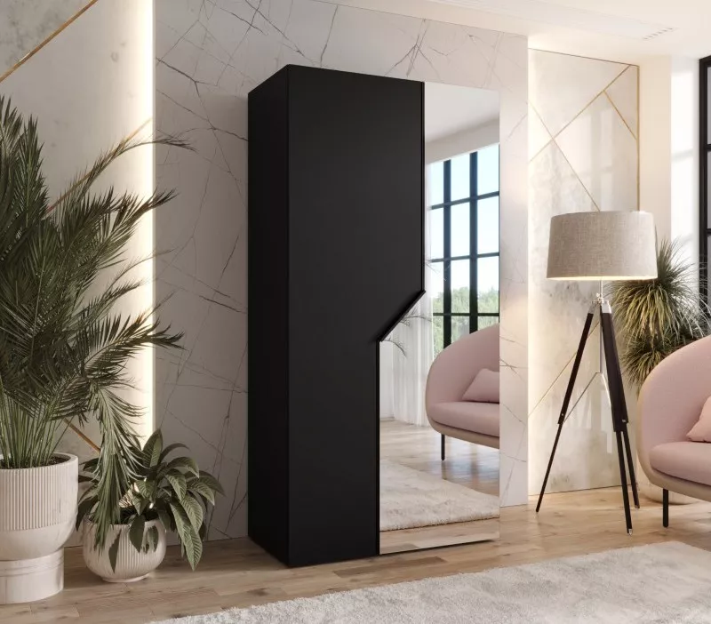 Úzká zrcadlová skříň 100 cm ELIRA 2 zaujme především svým minimalistickým provedením, díky kterému skvěle zapadne do všech stylů ložnic. Skříň disponuje zrcadlem, šatní tyčí a horní policí pro uložení bot nebo úložných boxů. Systém tichého dovírání zpříjemní každodenní používání.