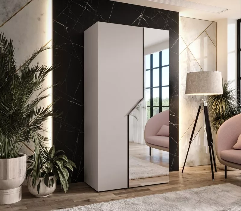 Úzká zrcadlová skříň 100 cm ELIRA 2 zaujme především svým minimalistickým provedením, díky kterému skvěle zapadne do všech stylů ložnic. Skříň disponuje zrcadlem, šatní tyčí a horní policí pro uložení bot nebo úložných boxů. Systém tichého dovírání zpříjemní každodenní používání.