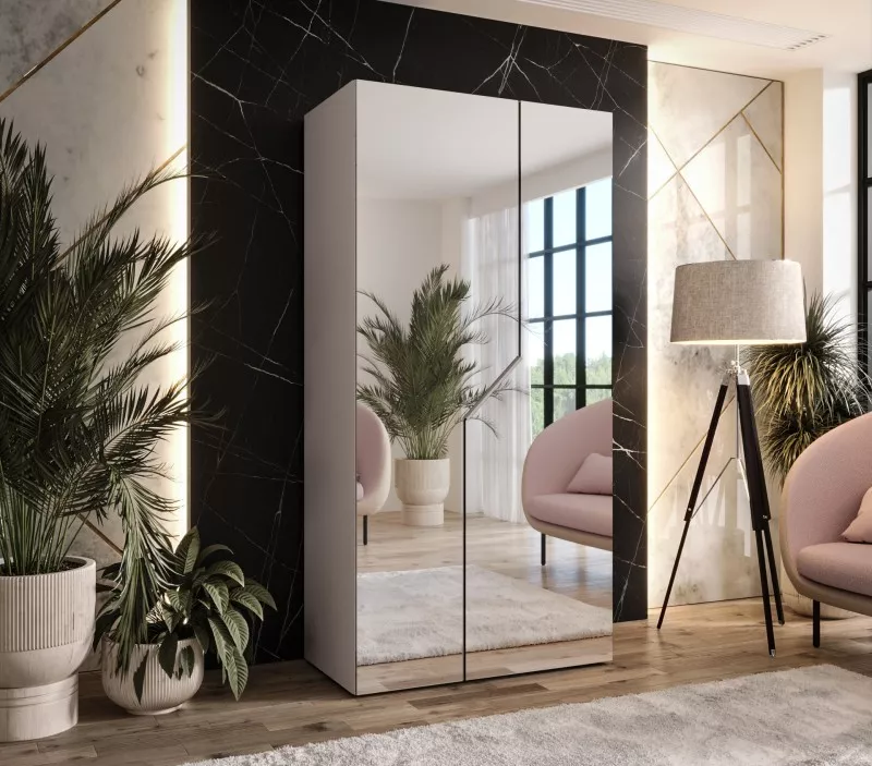 Šatní skříň 100 cm ELIRA 3 se zrcadlem zaujme především svým minimalistickým provedením, díky kterému skvěle zapadne do všech stylů ložnic. Skříň disponuje zrcadly, šatní tyčí a horní policí pro uložení bot nebo úložných boxů. Systém tichého dovírání zpříjemní každodenní používání.