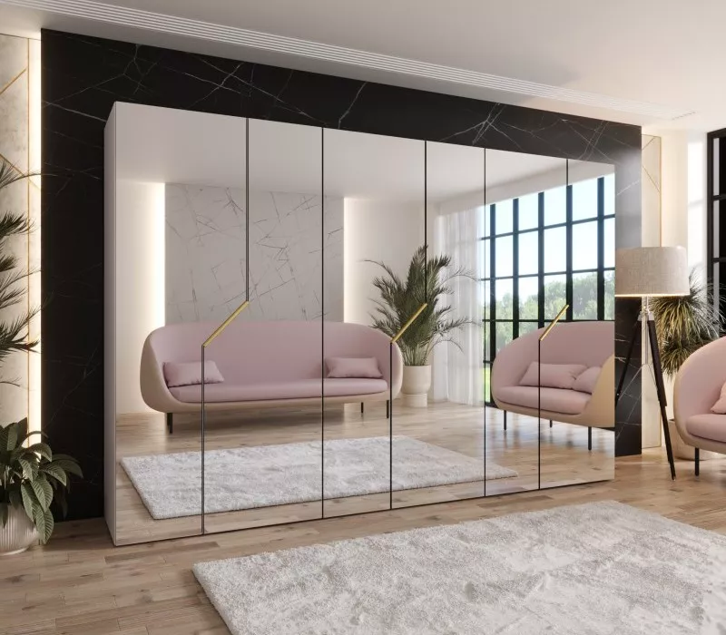 Široká zrcadlová skříň 300 cm ELIRA 3 zaujme především svým minimalistickým provedením, díky kterému skvěle zapadne do všech stylů ložnic. Skříň disponuje zrcadly, 3 šatními tyčemi a 3 horními policemi pro uložení bot nebo úložných boxů. Systém tichého dovírání zpříjemní každodenní používání.